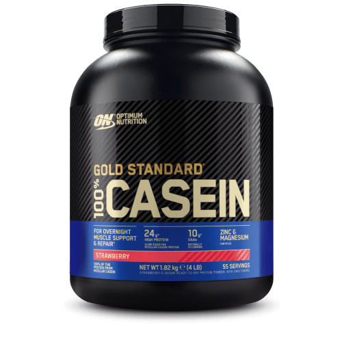 100% Casein Gold Standard Pulver von Optimum Nutrition mit Strawberry Geschmack in der 1.82KG Packung. 100% Casein von Optimum Nutrition mit 24g reinstem Protein je Portion. Was ist 100 % Casein Casein Gold Standard und wie wirkt es? Das 100% Casein Gold Standard ist das weltweit führende und erste rein mizellare Kasein auf dem Markt. Das langkettige Protein mit einem hohen Gehalt an BCAA‘s und L-Glutamin ist im Vergleich zum Whey oder Egg Protein deutlich dickflüssiger und fester. Damit liefert der cremige Shake 24 Gramm reinstes Protein und 3 Gramm Kohlenhydrate ohne Zuckerzusatz und mit nur sehr wenig Fett. Speziell zur Nachtruhe eignet sich Casein hervorragend, um den Muskelerhalt zu unterstützen. Für wen ist 100% Casein Gold Standard geeignet? Für Kraftsportler, Bodybuilder und Leichtathleten, die am Aufbau und Erhalt ihrer Muskelmasse interessiert sind – speziell in der nächtlichen Ruhephase, in der dem Körper nichts über weitere Lebensmittel zugeführt wird. Auch für Vegetarier geeignet! Anwendungstipps/Dosierung Casein sollte dem Körper abends zugeführt werden, denn nachts findet der Großteil des Muskelwiederaufbaus statt. Geben Sie 1 gehäuften M…
