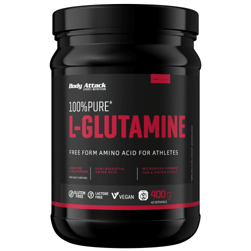 100% Pure L-Glutamin Pulver von Body Attack. 100% Pure L-Glutamin von Body Attack Das 100% Pure L-Glutamin überzeugt dich und deine Muskeln mit Top-Werten. Das Glutamin Pulver besticht durch seine Mikrofeinheit, blitzschnelle Löslichkeit, ist vegan und laktosefrei – einfach ideal zum Einrühren in Wasser oder deinem Eiweißshake! Verzehrempfehlung: Jeweils 5g (1 Messlöffel) in 150ml Flüssigkeit einrühren und vorzugsweise vor und nach dem Training verzehren.An Tagen ohne Training 5g mit reichlich Flüssigkeit morgens nach dem Aufstehen und abends vor dem Schlafengehen. 100% Pure L-Glutamin (400g) hat die PZN 09706836. Die Aminosäure für deine Aufbauprozesse!