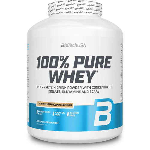 100% Pure Whey Pulver von BioTech USA mit Karamell-Cappuccino Geschmack in der 2.27KG Packung. 100% Pure Whey von BioTech USA Das 100% Whey Protein von BioTech USA ist ein hochwertiges, schnell verdauliches Proteinpulver, welches sich ideal zur Einnahme am Morgen und vor oder nach dem Krafttraning eignet. 100% Pure Whey von BioTech USA ist ein Whey Protein aus Wheyprotein-Konzentrat und -Isolat (mit sehr guter Bioverfügbarkeit). Es enthält neben allen EAAs (darunter auch die BCAA Leucin, Isoleucin und Valin mit fast 5g), semi- und nicht-essentielle Aminosäuren. Diese sind nicht künstlich zugefügt, sondern sind im Whey-Protein enthalten. Zusätzlich ist 100% Pure Wheyprotein glutenfrei, ohne Zuckerzusatz, sowie frei von Aspartam und Konservierungsstoffen. Der ideale Molkenprotein-Komplex für deine Muskeln!