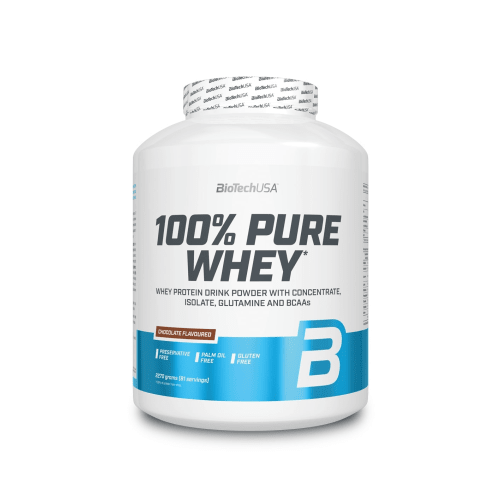 100% Pure Whey Pulver von BioTech USA mit Schokolade Geschmack in der 2.27KG Packung. 100% Pure Whey von BioTech USA Das 100% Whey Protein von BioTech USA ist ein hochwertiges, schnell verdauliches Proteinpulver, welches sich ideal zur Einnahme am Morgen und vor oder nach dem Krafttraning eignet. 100% Pure Whey von BioTech USA ist ein Whey Protein aus Wheyprotein-Konzentrat und -Isolat (mit sehr guter Bioverfügbarkeit). Es enthält neben allen EAAs (darunter auch die BCAA Leucin, Isoleucin und Valin mit fast 5g), semi- und nicht-essentielle Aminosäuren. Diese sind nicht künstlich zugefügt, sondern sind im Whey-Protein enthalten. Zusätzlich ist 100% Pure Wheyprotein glutenfrei, ohne Zuckerzusatz, sowie frei von Aspartam und Konservierungsstoffen. Der ideale Molkenprotein-Komplex für deine Muskeln!