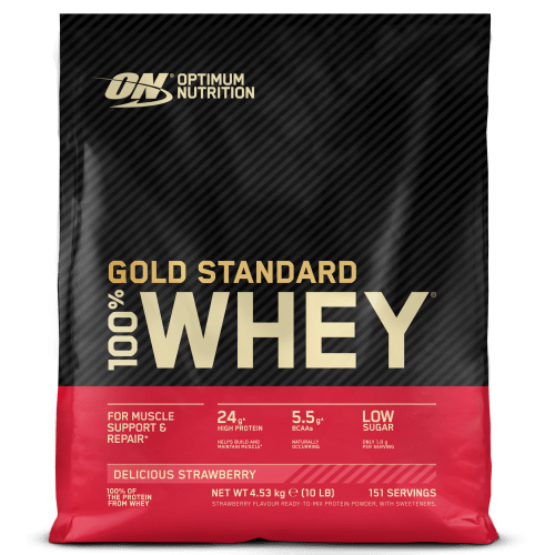100% Whey Gold Standard Pulver von Optimum Nutrition mit Erdbeere Geschmack in der 4.53KG Packung. Was ist 100% Whey Gold von Optimum Nutrition und wie wirkt es? Optimum Nutrition Whey Gold Standard Protein ist einer der begehrtesten Proteinshakes überhaupt! Der cremige Drink wurde nun schon zum dritten Jahr in Folge in den USA bei den Supplement Award als „Overall Supplement Of The Year“ und als „Protein Powder Of The Year“ mit zwei Awards ausgezeichnet. Der Shake enthält das wertvolle Whey-Protein, das als schnellste Eiweißquelle überhaupt gilt und bei Kraft- sowie Leistungssportlern gleichermaßen beliebt ist. Das Protein wirkt als energiereicher Drink vor dem Training und hilft nach dem Training dem Muskelaufbau und -erhalt. 100% Whey Gold von Optimum Nutrition setzt sich aus hochwertigem Molkenprotein und Molkenprotein-Isolat zusammen und enthält zudem Lactogolbulin, Glycomakropeptide und weitere spezifische Eiweiße. Egal ob Soft-, Normal- oder Hardgainer, figurbewusster Sportler oder Diät-Athlet: Whey Gold ist optimal für jeden Trainingsansatz und kann zusätzlich zu den Mahlzeiten oder als deren Ersatz konsumiert werden. Der cremige Shake ist in unzähligen leckeren Geschmacksrichtungen erhältlich und sollte zum täglichen Begleiter deines Fitnesstraining werden. Hol dir das mehrfach ausgezeichnete „Supplement of the Year“!