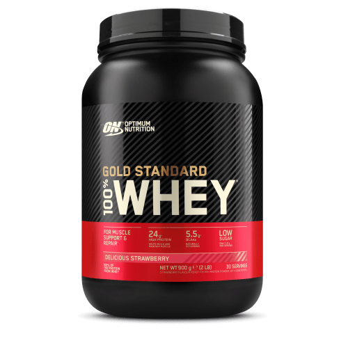 100% Whey Gold Standard Pulver von Optimum Nutrition mit Erdbeere Geschmack in der 0.9KG Packung. Was ist 100% Whey Gold von Optimum Nutrition und wie wirkt es? Optimum Nutrition Whey Gold Standard Protein ist einer der begehrtesten Proteinshakes überhaupt! Der cremige Drink wurde nun schon zum dritten Jahr in Folge in den USA bei den Supplement Award als „Overall Supplement Of The Year“ und als „Protein Powder Of The Year“ mit zwei Awards ausgezeichnet. Der Shake enthält das wertvolle Whey-Protein, das als schnellste Eiweißquelle überhaupt gilt und bei Kraft- sowie Leistungssportlern gleichermaßen beliebt ist. Das Protein wirkt als energiereicher Drink vor dem Training und hilft nach dem Training dem Muskelaufbau und -erhalt. 100% Whey Gold von Optimum Nutrition setzt sich aus hochwertigem Molkenprotein und Molkenprotein-Isolat zusammen und enthält zudem die verzweigtkettigen Aminosäuren BCAA, Lactogolbulin, Glycomakropeptide und weitere spezifische Eiweiße. Jede Portion enthält mehr als 4 Gramm Aminosäuren sowie 5 Gramm BCAAs (Leucine, Isoleucine, und Valine)! Egal ob Soft-, Normal- oder Hardgainer, figurbewusster Sportler oder Diät-Athlet: Whey Gold ist optimal für jeden Trainingsansatz und kann zusätzlich zu den Mahlzeiten oder als deren Ersatz konsumiert werden. Der cremige Shake ist in unzähligen leckeren Geschmacksrichtungen erhältlich und sollte zum täglichen Begleiter deines Fitnesstraining werden. Hol dir das mehrfach ausgezeichnete „Supplement of the Year“!