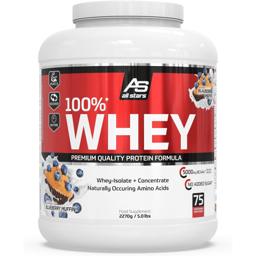 100% Whey Premium Pulver von All Stars mit Blueberry Muffin Geschmack in der 2.27KG Packung. Was ist 100% Whey Premium Protein von All Stars und wie wirkt es? 100% Whey Protein von All Stars setzt auf Whey-Protein-Konzentrat und Whey-Protein-Isolat. Es enthält Glutamin, Taurin und L-Leucin sowie die Enzyme Papain und Bromelain. Allen Bodybuildern und Power-Liftern, die reichlich Proteine, aber wenig Kohlenhydrate und Fett zu sich nehmen wollen, kann 100% Whey Premium Protein von All Stars also wärmstens empfohlen werden. Der leckere Eiweiß-Shake zielt nicht nur auf einen Muskelaufbau, sondern auch Erhalt ab. Mische 30g 100% Whey Protein von All Stars mit 250ml Wasser oder 300ml Milch. Trinke einen Shake pro Tag möglichst direkt nach dem Training. Achte darauf, die angegebene, empfohlene tägliche Verzehrmenge nicht zu überschreiten. Allergene: Enthält Milch, Laktose und Soja. Verzehrempfehlung: 30g Pulver (1 Dosierlöffel = 1 Portion) mit 250ml Wasser oder 300ml Milch in einem Shaker mixen. Trinke 1 Shake täglich (bei Bedarf mehr), am besten zum Frühstück, als Zwischenmahlzeit, vor oder direkt nach dem Training. Das 100% Whey-Protein von All Stars besteht aus Whey-Konzentrat und Whey-Isolat.