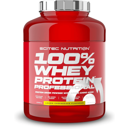 100% Whey Protein Professional Pulver von Scitec Nutrition mit Lemon Cheesecake Geschmack in der 2.35KG Packung. Scitec Nutrition – 100% Whey Professional 100% Whey Protein Professional – eine Mischung aus Molkeneiweiß-Konzentrat und -Isolat, angereichert mit zusätzlichem L-Leucin, L-Glutamin und Taurin und einem Enzymkomplex. Das Proteinpulver ist in zahlreichen, leckeren Geschmacksrichtungen erhältlich. 100% Whey Protein Professional von Scitec Nutrition – Vorteile: 22g Protein je 30g Pulver Portion unter 1,5g Kohlenhydrate angereichert mit weiteren Aminosäuren zahlreiche Geschmacksrichtungen verfügbar Verdauungsenzyme Bromelain und Papain enthalten Was beinhaltet das 100% Whey Protein Professional? Neben Molkenprotein-Konzentrat ist auch -Isolat im Pulver enthalten. Molke liefert alle wichtigen Aminosäuren, dennoch hat Scitec eine zusätzliche Portion L-Leucin, L-Glutamin und Taurin zugefügt. Ebenfalls wurde das Eiweißpulver, zur besseren Verfügbarkeit, mit Bromelain und Papain (beides Verdauungsenzyme) angereichert. Warum 100% Whey Protein Professional? Das 100% Whey Protein Professional beinhaltet hochwertiges Molkeneiweiß, das der Körper insbesondere für das Muskelwachstum und den Muskelerhalt verwendet. Es enthält alle 9 lebensnotwendigen Aminosäuren, die der Körper nicht selbst synthetisieren kann und über die Nahrung oder Nahrungsergänzungsmittel aufnehmen muss. Die zusätzlich zugefügte Aminosäuren-Matrix mit L-Leucin, L-Glutamin und Taurin bietet zusätzlichen Stoff für eine gute Regeneration und den Muskelaufbau.Im Gegensatz zu vielen anderen Eiweißpulvern sind dem Pulver die Verdauungsenzyme Bromelain und Papain zugefügt, die insbesondere am Eiweißstoffwechsel und der Aufspaltung der Proteine in kleine, schnell verfügt- und nutzbare Eiweißbausteine beteiligt sind und dem Körper dadurch die nach dem Training benötigten Eiweiße schnell zur Verfügung stellen.Das 100% Whey Protein Professional kann von Athleten der verschiedensten Sportarten verwendet werden, meist wird es nach dem Krafttraining oder einer intensiven Ausdauereinheit als Post-Workout-Shake genutzt. Wie wird 100% Whey Protein Professionell verwendet? Für 1 Portion 100% Whey Professional mische 30g Pulver (3/4 Messbecher) mit 250ml Wasser, Milch oder einer anderen Flüssigkeit. An Trainingstagen vorzugsweise nach dem Training trinken. 100% Whey Protein Professional – eine Mischung aus Molkeneiweiß-Konzentrat und -Isolat, angereichert mit zusätzlichem L-Leucin, L-Glutamin und Taurin und einem Enzymkomplex.