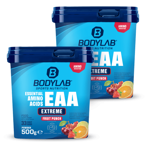 2 x EAA Extreme Pulver von Bodylab24. Unser Doppelpack für die schnelle und einfache Versorgung mit den essenziellen Aminosäuren. Essenzielle Aminosäuren sind die kleinsten Eiweißbausteine und für Deinen Körper und die Muskeln lebensnotwendig. Sie sind besonders rund ums Training und für die Regeneration, den Muskelerhalt und -aufbau wichtig. Der fruchtige Bodylab24 EAA Extreme Drink ist ein schnell gemixtes Getränk für zwischendurch oder rund ums Training, der Deinen Muskeln EAA + Glutamin + Alanin liefert und zur sportlichen Leistungsfähigkeit und schnellen Regeneration beiträgt.