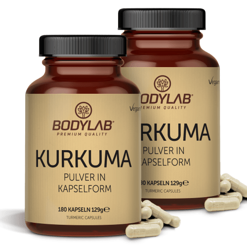 2 x Kurkuma Pulver in Kapselform Kapseln von Bodylab24. Bodylab – Dein Experte für Muskelaufbau, Fitness, Abnehmen und gesunde Ernährung. Wir sind der führende Online Shop für Supplements und Sportnahrung. Egal ob Proteinpulver für Deinen Eiweißshake oder Proteinriegel: Wenn Du Eiweiß kaufen willst, findest Du in unserem Protein Shop alles was das Herz begehrt. Mit Eiweißprodukten unserer Eigenmarke Bodylab24 erhältst Du höchste Qualität zu unschlagbaren Preisen. Natürlich findest Du bei Bodylab24 auch eine umfangreiche Auswahl hervorragender Sportnahrung anderer Hersteller. Sämtliche angebotenen Produkte mussten uns vor der Listung von ihrer einwandfreien und guten Qualität sowie einem fairen Preisleistungsverhältnis überzeugen. BODYLAB Kurkuma Pulver in Kapselform enthält reines, frisch und fein gemahlenes Kurkumapulver, gewonnen aus der Kurkumawurzel. Je Kapsel sind 600 mg Kurkuma enthalten. Die Kapseln bieten sich als einfach verwendbare und leicht zu dosierende Variante für den Alltag oder rund um sportliche Aktivitäten an. Sie können einfach mit Wasser eingenommen werden – die Tagesdosis kann in zwei Dosierungen zu je 4 Kapseln mit Wasser oder einer anderen Flüssigkeit nach Wahl eingenommen werden.