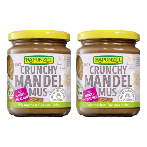 2x Mandelmus Crunchy Rapunzel. Mit viel Erfahrung, Hingabe und Sorgfalt hergestellt, bestehen die Nussmusse zu 100% aus Mandeln aus Europa. Die Mandeln werden fein geröstet und sorgfältig vermahlen, um einen intensiv-aromatischen Genuss zu bieten. Knackige Mandelstückchen sorgen für den besonderen Crunch. Da ausschließlich Bio-Nüsse verwendet und auf Zusätze verzichtet wird, kann sich das nusseigene Öl an der Oberfläche absetzen. Einfach kräftig durchrühren, und das Mus wird wieder cremig. Seit 1974 stellt Rapunzel Nussmusse in eigener Herstellung her. Beim Rösten entfaltet sich das volle Aroma der Mandeln, das anschließend durch feines Vermahlen perfekt zur Geltung kommt. Die sorgfältige Herstellung garantiert dir einen einzigartigen Geschmack!