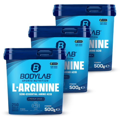 3 x Arginine Powder Pulver von Bodylab24. Jetzt im 3er Pack – reines Argininpulver, frei von weiteren Zusatzstoffen, zucker- und aspartamfrei. Hergestellt aus Mais- oder Zuckerrübenmolasse – 100% vegan. Ideal in Kombination mit einem Kreatin-Supplement – z.B. Creatine (Creapure®) (500g) oder Creatne Powder (500g), und Beta-Alanine (500g).