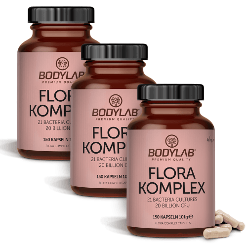 3 x Flora Complex / Komplex Kapseln von Bodylab24. Bodylab – Dein Experte für Muskelaufbau, Fitness, Abnehmen und gesunde Ernährung. Wir sind der führende Online Shop für Supplements und Sportnahrung. Egal ob Proteinpulver für Deinen Eiweißshake oder Proteinriegel: Wenn Du Eiweiß kaufen willst, findest Du in unserem Protein Shop alles was das Herz begehrt. Mit Eiweißprodukten unserer Eigenmarke Bodylab24 erhältst Du höchste Qualität zu unschlagbaren Preisen. Natürlich findest Du bei Bodylab24 auch eine umfangreiche Auswahl hervorragender Sportnahrung anderer Hersteller. Sämtliche angebotenen Produkte mussten uns vor der Listung von ihrer einwandfreien und guten Qualität sowie einem fairen Preisleistungsverhältnis überzeugen. Vegane Pro- und Präbiotika in Kapselform, angereichert mit den Mineralstoffen Calcium, Zink und Selen. Mit einer Milchsäurekulturenmischung aus 1 Mrd. KbE pro Stamm (außer Lactobacillus bulgaricus und johnsonii mit je 0,5 Mrd. KbE) je Tagesdosis, bestehend aus 3 Kapseln. Das Bild kann von der tatsächlichen gelieferten Verpackung leicht abweichen