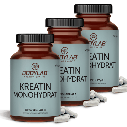 3 x Kreatin Monohydrat Kapseln von Bodylab24. Bodylab – Dein Experte für Muskelaufbau, Fitness, Abnehmen und gesunde Ernährung. Wir sind der führende Online Shop für Supplements und Sportnahrung. Egal ob Proteinpulver für Deinen Eiweißshake oder Proteinriegel: Wenn Du Eiweiß kaufen willst, findest Du in unserem Protein Shop alles was das Herz begehrt. Mit Eiweißprodukten unserer Eigenmarke Bodylab24 erhältst Du höchste Qualität zu unschlagbaren Preisen. Natürlich findest Du bei Bodylab24 auch eine umfangreiche Auswahl hervorragender Sportnahrung anderer Hersteller. Sämtliche angebotenen Produkte mussten uns vor der Listung von ihrer einwandfreien und guten Qualität sowie einem fairen Preisleistungsverhältnis überzeugen. Kreatin setzt sich aus Arginin, Glycin und Methionin zusammen und zählt im Wesentlichen zu den Aminosäuren. Zahlreiche Studien zu Kreatin Monohydrat haben die Möglichkeiten zur Leistungssteigerung durch die Einnahme von Kreatin mittlerweile belegt. Die Europäische Behörde für Lebensmittelsicherheit (EFSA) hat in einer Erklärung folgende Wirkungsweise von Kreatin offiziell anerkannt: Ab einer Einnahme von 3 g Kreatin pro Tag erhöht sich die körperliche Leistung bei Schnellkrafttraining im Rahmen kurzzeitiger intensiver körperlicher Betätigung.