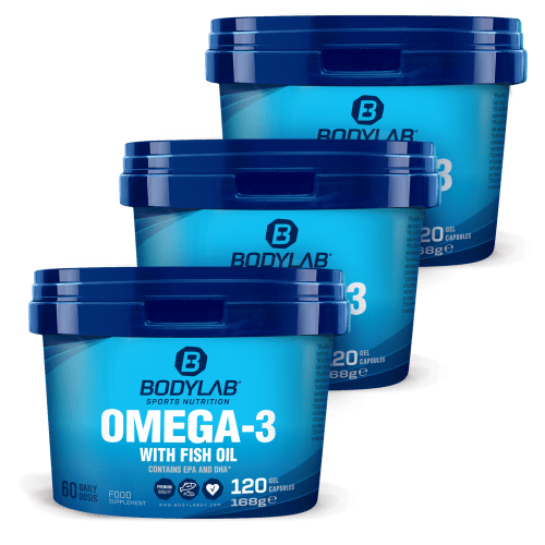 3 x Omega-3 Kapseln von Bodylab24. Omega-3 Softgel- Kapseln jetzt im 3er Pack zum Sparpreis.Die Kapseln liefern wichtige Omega-3 Fettsäuren zur Anreicherung der täglichen Ernährung. Die Tagesdosis von 2 Kapseln enthält neben Ecosapentaensäure (EPA) und Docosahexaensäure (DHA) auch Vitamin E.