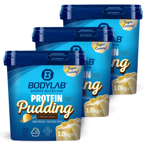 3 x Protein Pudding Pulver von Bodylab24. Jetzt direkt im 3er Pack bestellen. Den neuen Bodylab Protein Pudding in 8 herrlich cremigen Geschmackvarianten. Wähle Deine 3 liebsten Puddinggeschmäcker. Einfach mit fettarmer Milch nach Packungsanweisung in einem Shaker mischen, kurz kühl stellen und direkt genießen. Es ist kein Erwärmen der Milch und anschließendes Abkühlen nötig – einfach zwischendurch ein süßes Highlight gönnen oder als Dessert zur Hauptmahlzeit genießen und für ein kleines Proteinplus zwischendurch sorgen.