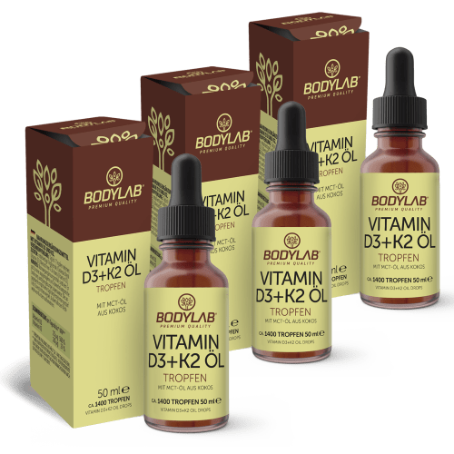 3 x Vitamin D3 + K2 Öl Tropfen Bodylab24. Bodylab – Dein Experte für Muskelaufbau, Fitness, Abnehmen und gesunde Ernährung. Wir sind der führende Online Shop für Supplements und Sportnahrung. Egal ob Proteinpulver für Deinen Eiweißshake oder Proteinriegel: Wenn Du Eiweiß kaufen willst, findest Du in unserem Protein Shop alles was das Herz begehrt. Mit Eiweißprodukten unserer Eigenmarke Bodylab24 erhältst Du höchste Qualität zu unschlagbaren Preisen. Natürlich findest Du bei Bodylab24 auch eine umfangreiche Auswahl hervorragender Sportnahrung anderer Hersteller. Sämtliche angebotenen Produkte mussten uns vor der Listung von ihrer einwandfreien und guten Qualität sowie einem fairen Preisleistungsverhältnis überzeugen. Die Vitamin D3 + K2 Öl Tropfen enthalten mit diesen beiden Vitaminen die perfekte Kombi für Knochen* und Immunsystem**. Nur ein Tropfen täglich deckt deinen normalen Tagesbedarf an Vitamin D3 und K2. Die fettlöslichen Vitamine sind zugesetzt zu hochwertigem MTC-Öl (MCT = medium-chain triglycerides) aus Kokos für die einfache Dosierung über die enthaltene Pipette. Eine optimale Kombination (nicht nur) für die dunkle Jahreszeit. * Vitamin K trägt zur Erhaltung normaler Knochen bei. **Vitamin D trägt zu einer normalen Funktion des Immunsystems bei.