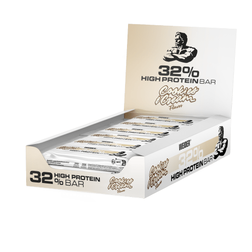 32% Protein Bar Riegel von Weider mit Cookies & Cream Geschmack in der 0.72KG Packung. Weider – 32% Protein Bar 19g Eiweiß und satt Kohlenhydrate je Riegel – ideal als Zwischensnack und in zahlreichen Geschmacksrichtungen erhältlich. 32% Protein Bar von Weider – Vorteile: 32% Protein je Riegel ca. 25g Kohlenhydrate pro Portion (variiert je nach Geschmacksrichtung) Snack für zwischendurch, vor oder nach dem Training zahlreichen Geschmacksvarianten einzeln verpackt Was beinhaltet der 32% Protein Bar von Weider? Die einzeln verpackten Riegel liefern neben 32% Protein auch einen ansehnlichen Kohlenhydratanteil. Dieser liegt bei etwa 45%. Mit einem hohen Zuckeranteil liefert der Riegel damit auch schnelle Energie, zur Anreicherung der Energiereserven vor dem Training oder zur schnellen Auffüllung der Speicher nach dem Training. Warum 32% Protein Bar? Besonders in Aufbauphasen benötigt der Körper wertvolle Eiweißbausteine für den gezielten Muskelaufbau. Um das Training effektiv und intensiv gestalten zu können sind Kohlenhydrate als Energielieferant erforderlich und es sollte zusätzlich auf eine Ernährung geachtet werden, die auf das angestrebte Ziel abgestimmt ist. Der 32% Protein Bar kann rund ums Training für zusätzlich Energie und Eiweiß; sorgen, dass der Körper direkt beim und nach dem Training nutzen kann.Die Riegel sind in zahlreichen Varianten erhältlich, durch die Einzelverpackung einfach und problemlos zu transportieren und ideal für unterwegs. Wie werden die 32% Protein Bars verwendet und wer nutzt sie? Die Riegel können nach Bedarf als Snack zwischendurch oder rund ums Training verwendet werden.Sportler aus den unterschiedlichsten Sportarten können die 32% Proteinriegel zur Anreicherung ihrer Kohlenhydrat- und Eiweißversorgung verwenden. Meist werden die Riegel gezielt vor oder nach dem Training gegessen. 19g Eiweiß und satt Kohlenhydrate je Riegel – ideal als Zwischensnack!