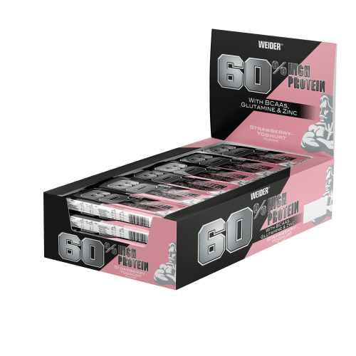 60% Protein Bar Riegel von Weider mit Strawberry Yoghurt Geschmack in der 1.08KG Packung. 60% Protein Bar von Weider Protein gehört in seinen verschiedenen Darreichungsformen, egal ob Shake, Pancake oder Riegel, zu den klassischen Standardsupplements, die auch von zahlreichen Hobbysportlern konsumiert werden. Rund ums Training sollten die Muskeln mit genügend Eiweiß für die Regeneration versorgt werden. Auch wer Muskeln aufbauen möchte, braucht eine gute Proteinversorgung, damit dem Körper genügend Bausteine für das Muskelwachstum zur Verfügung stehen. Die 45g Riegel sind einzeln verpackt und passen bequem in jede Tasche, egal ob sie mit ins Büro genommen, vor oder nach dem Training konsumiert werden. Sie bieten Abwechslung und können als Alternative zum Shake genutzt werden. Der Klassiker unter den Riegeln!