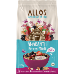 Amaranth Beeren-Müsli bio Allos mit Wildbeeren Geschmack in der 0.375KG Packung. Was ist Amaranth Beeren-Müsli bio von Allos und wie wirkt es? Amaranth Beeren-Müsli von Allos enthält Amaranth-Körner, welche schon bei den Inkas verehrt und als Nahrungsmittel eingesetzt wurden. Allos hat nun ein sehr leckeres Müsli gezaubert, welches mit Erdbeeren, Cranberries, Sauerkirschen und Brombeeren angereichert wurde. So ist es ein nahrhaftes Frühstück, das dir für den Start in den Tag wichtige Vitamine liefern kann. Es ist für all jene geeignet, welche sich leicht, gesund und ausgewogen ernähren. Amaranth Beeren-Müsli von Allos Waldhonig kann jederzeit mit Milch, Fruchtsaft, in Joghurt oder Quark genossen werden. Manche knabbern es auch einfach so. Eco control number: DE-ÖKO-001 Für einen guten Start in den Tag!