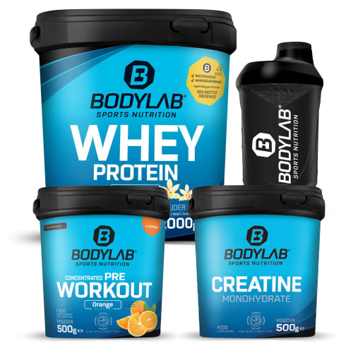 Amin’s Extreme Aufbau Pack Bodylab24. Warum Amin’s Extreme Aufbau Pack? Unser Bodylab Whey Protein wird aus frischer Molke hergestellt und liefert eine hochwertige Proteinquelle für Deine Muskeln, die diese sehr schnell aufnehmen und verarbeiten können. Protein unterstützt Dich beim Aufbau und Erhalt von Muskelmasse und ist ideal zur Nutzung rund ums Training und am Morgen nach der Nachtphase ohne Eiweißversorgung.Das Bodylab Creatine Powder liefert bestes Kreatin für Deinen Muskelaufbau. Es ist hochwertigste und 100% reines Kreatinmonohydrat zur täglichen Zusatzversorgung. Unser lang bewährtes Concentrated Pre Workout gibt Dir dazu den richtigen Schub fürs Training.Beste Produkte für intensiv und hart trainierende Athleten und Athletinnen in lecker fruchtigen Geschmacksvarianten. Erreiche Dein nächstes Trainingslevel mit besten Supps von Bodylab! Eine absolute Top-Kombination aus Kreatin, Pre Workout und Protein findest Du in Amin’s Extreme Aufbau Pack. 2kg bestes Bodylab Whey Protein + 500g bestes Creatine Powder und 500g Concentrated Pre Workout.Beim Whey hast Du die Wahl zwischen zahlreichen fruchtigen und milchshakeartigen Geschmacksvarianten, das Creatine Powder ist geschmacksneutral und beim Concentrated Pre Workout Pulver kannst Du zwischen fruchtigen Geschmacksrichtungen wählen. Ein Shaker für beste Mischergebnisse ist ebenfalls dabei.Beste Supplements für Dein Muskeltraining.