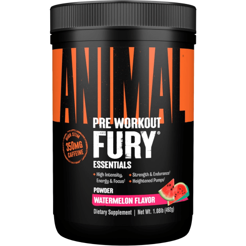 Animal Fury Pulver von Universal Nutrition mit Watermelon Geschmack in der 0.491KG Packung. Universal Nutrition – Animal Fury Ein Pre-Workout Booster für den Schub beim professionelle Krafttraining. Animal Fury von Universal – Vorteile: bewährte Pre-Workout Inhaltsstoffe 5g BCAA enthalten 350mg Koffein je Portion gut löslich in lecker fruchtigen Geschmacksrichtungen Was beinhaltet Animal Fury? Neben klassischen Pre-Workout Inhaltsstoffen wie Citrullinmalat, Beta-Alanin, L-Tyrosin und Koffein ist mit 5g eine gute Portion BCAA (L-Leucin, L-Isoleucin und L-Valin – essentielle Aminosäuren) beigefügt. Das Pulver ist mit Süßstoff gesüßt und enthält natürliche und künstliche Aromastoffe. Warum Animal Fury? Animal Fury ist ein klassischer Pre-Workout Booster der zusätzlich mit wertvollen und essentiellen BCAA angereichert wurde und damit Bausteine für Dein Muskelwachstum liefert. Von Universal speziell für professionelle Athleten entwickelt, liefert er wertvolle Inhaltsstoffe für Fokus, Konzentration und den richtigen Kick für ein intensives Training. Wer verwendet Animal Fury? Das Pre-Workout Pulver wird vorwiegend von professionell trainierenden Bodybuildern, Gewichthebern und Kraftsportlern genutzt. Wie wird Animal Fury verwendet? Für 1 Portion mische 1 Messlöffel Animal Fury mit 250ml Wasser. Die fertige Mischung ca. 30 Minuten vor dem Training trinken. Das Pulver ist koffeinhaltig, daher nicht kurz vor dem Schlafengehen konsumieren. Vom Hersteller wird zu Beginn der Nutzung eine schwächere Dosierung empfohlen, um die persönliche Wirkung zu testen. Animal Fury ist dein kompromissloser Pre-Workout-Booster – entwickelt für Athleten, die alles geben. Mit einer starken Mischung aus Citrullin-Malat, Beta-Alanin, L-Tyrosin, Koffein und 5 g BCAAs pro Portion liefert jeder Scoop geballte Energie und Fokus für intensive Trainingseinheiten. Einfach 1 Messlöffel mit 250 ml Wasser mischen und ca. 30 Minuten vor dem Training trinken. Für Einsteiger empfiehlt sich eine reduzierte Dosierung, um die persönliche Verträglichkeit zu testen. Erhältlich in zwei leckeren Geschmacksrichtungen – Green Apple & Watermelon