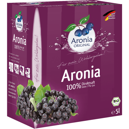 Aronia 100% Direktsaft bio Aronia Original mit Aronia Geschmack in der 5L Packung. Was ist Aronia 100% Direktsaft bio von Aronia Original und wie wirkt es? 100% Aronia-Muttersaft von Aronia-Original ist ein reines Naturprodukt, das in Sachsen direkt gepresst, schonend verarbeitet und abgefüllt wurde. Es handelt sich um unverdünnten Direktsaft ohne weitere Zusätze. Die süß-säuerlich-herb schmeckende Aroniabeere – zu Deutsch „Schwarze Eberesche“ oder „Apfelbeere“ – ist in Europa seit rund 110 Jahren bekannt, und wird wegen ihrer besonderen Vorzüge geschätzt. Für wen ist Aronia 100% Direktsaft geeignet? Aronia 100% Direktsaft eignet sich für alle, die ihrem Körper Gutes tun wollen und großen Wert auf eine Ernährung mit gesunden und natürlichen Lebensmitteln legen. Der Saft kann sowohl warm als auch kalt genossen werden und schmeckt pur oder verdünnt gleichermaßen. Für beste Ergebnisse trinke täglich ein Glas (ca. 200ml) Aroniasaft von Aronia Original und genieße ihn. Eco control number: DE-ÖKO-006 Dein Natursaft aus Aronia!