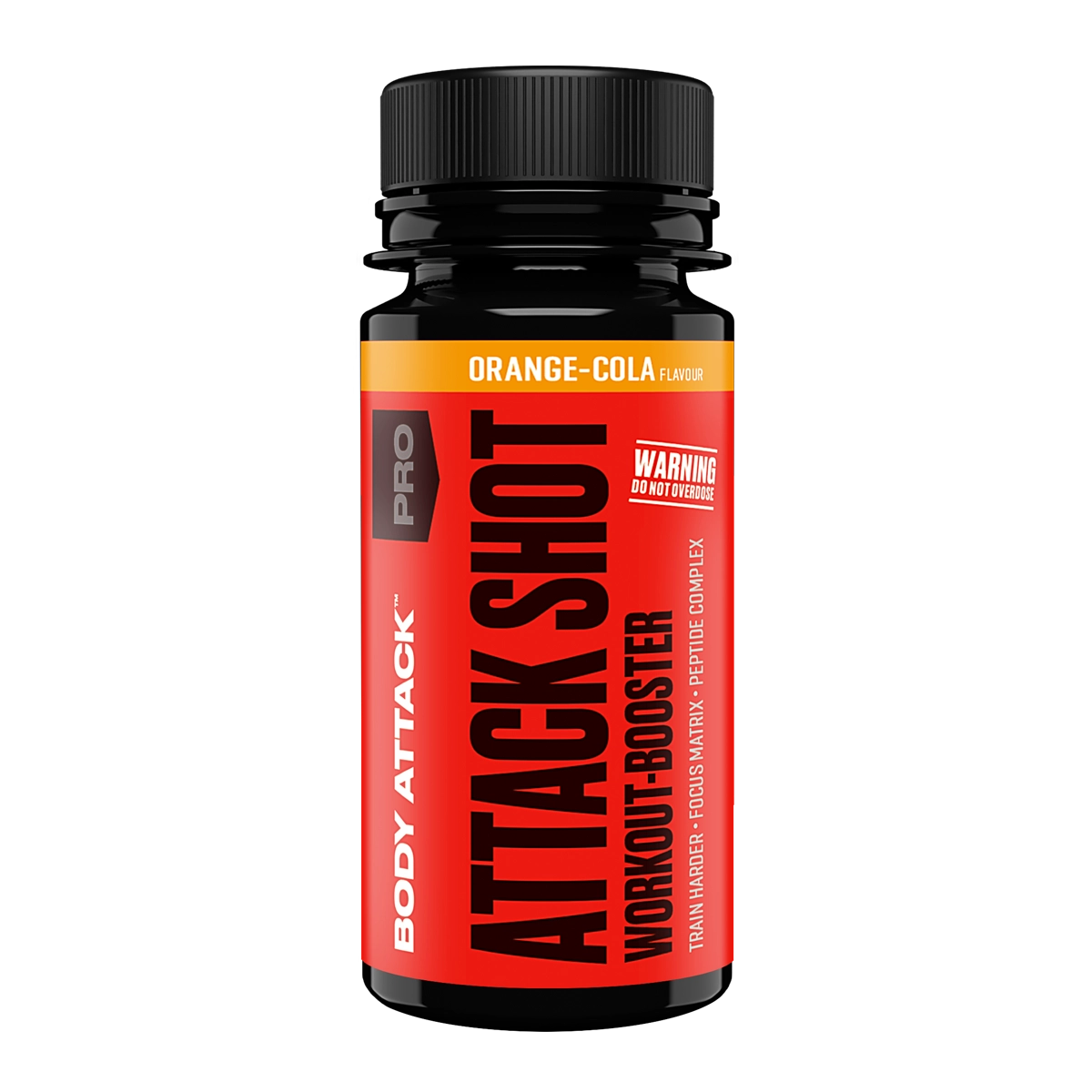 Pre-Workout Booster im Taschenformat gefällig? Aber Achtung! Diese Shots haben es in sich. Du auch? Dann bist du bereit für ein Energie- und Leistungslevel, das dich vom üblichen Gym-Besucher abhebt. Hier kommt der ATTACK SHOT! Der beste Trainingsbooster, der für ein Kribbeln in den Fingern sorgt, sodass sich die Hantelstangen biegen. Hier wirken nur beste Inhaltsstoffe wie Beta-Alanin, patentiertes L-Citrullin CitruSyn® und Koffein als Wachmacher. Train harder mit maximalen Fokus! Für die Unterstützung folgender Ziele ist der ATTACK SHOT die richtige Wahl: Muskelaufbau- und erhalt Intensivere Trainingseinheiten Mehr Kraftzuwachs Für wen ist der ATTACK SHOT geeignet: Fitness-Begeisterte, die nach härteren Workouts streben Athleten, Wettkampf- und KraftsportlerFitness-Sportler, die den Pump-Effekt suchen Dieser Shot haut voll rein! Tequila, Wodka-Shot? Wir haben etwas, das richtig knallt: Den besten Trainingsbooster, der perfekt in jede Hosentasche passt. Der ATTACK SHOT von Body Attack. Die extra starke Energy Boost Formula aus hochwertigen Inhaltsstoffen verwandelt dein herkömmliches Workout in ein Trainingserlebnis der Superlative. Die Energy Boost Formula besteht aus 200mg Koffein*, 1000mg Taurin, 500mg Glycerolpulver GLYCOPUMP® und Vitamin B6**, um deine Workouts mit energiegeladenem Fokus auf Hochtouren zu bringen. Mit CitruSyn® – der reinsten Form von L-Citrullin Du möchtest das härteste, stärkste und beste an wirksamen Inhaltsstoffen? Du fragst dich, welcher Trainingsbooster dir das liefert? Na, der hier! Im ATTACK SHOT steckt die volle Power und patentiertes L-Citrullin in Form von CitruSyn®. Bei diesem Wirkstoff kannst du dir sicher sein, garantiert 100% L-Citrullin in seiner reinsten Form zu bekommen. Zum Vergleich: L-Citrullin Malate erreichen lediglich eine 70%ige L-Citrullin-Konzentration. Im ATTACK SHOT wartet aber die hochdosierte und reinste Form auf dich – weil du das Stärkste verdienst. Damit deine Workouts noch krasser werden! *Koffein trägt zur Verringerung von Müdigkeit und Ermüdung bei **Vitamin B6 trägt zu einer Verringerung von Müdigkeit und Ermüdung bei