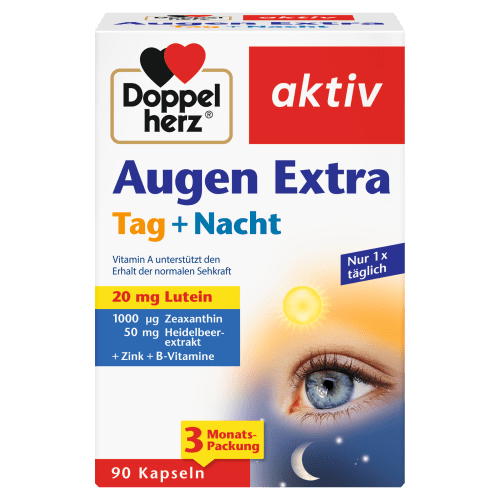 Augen Extra Tag + Nacht Kapseln von Doppelherz. Augen Extra Tag + Nacht Kapseln von Doppelherz Die Kapseln von Doppelherz enthalten die Vitamine A, C und E, wertvolle B-Vitamine sowie die Spurenelemente Zink und Kupfer. Zusätzlich enthalten sind 20 mg Lutein, 1000 µg Zeaxanthin und ein Extrakt aus Heidelbeerfrüchten. Vitamin A trägt Tag und Nacht zur Aufrechterhaltung der normalen Sehkraft bei. Zink leistet einen Beitrag zur normalen Sehkraft und unterstützt den normalen Vitamin A-Stoffwechsel. Vitamin B6 leistet einen Beitrag zur normalen Funktion des Nervensystems. Folsäure trägt zur normalen Zellteilung bei. Vitamin B12 leistet einen Beitrag zu einem normalen Energiestoffwechsel. Vitamin C + E sowie Zink + Kupfer tragen dazu bei, die Zellen vor oxidativem Stress zu schützen. Lutein und Zeaxanthin kommen in pflanzlichen Lebensmitteln (z. B. grünem Gemüse) vor. Sie sind pflanzliche Carotinoide, die zur Gruppe der sekundären Pflanzenstoffe gehören. Der sogenannte „Gelbe Fleck“ (Makula) der Netzhaut enthält eine hohe Konzentration an Lutein und Zeaxanthin. Er liegt in der Mitte des Augenhintergrundes. Die gelbe Farbe ist dem Vorhandensein dieser beiden Carotinoide zuzuschreiben. Die Anreicherung der Pflanzenstoffe findet genau dort statt, wo ein hoher Antioxidantien-Schutz benötigt wird. Denn speziell im Bereich der Makula fällt das Sonnenlicht nahezu ungebrochen ein. Der „Gelbe Fleck“ befähigt zum Lesen, Erkennen von feinen Einzelheiten und Unterscheiden von Farben. Heidelbeeren sind eine beliebte Beerensorte für die menschliche Ernährung. Sie wurden bereits vor Jahrhunderten in den Wäldern und Mooren Europas wild gesammelt und geschätzt. Die Doppelherz Augen Extra Kapseln liefern 50 mg Heidelbeerextrakt. Das Auge ist eines der erstaunlichsten Organe des menschlichen Körpers und ist Tag und Nacht gefordert. Arbeiten am Computer, häufiges Fernsehen und nächtliche Autofahrten sind besonders anstrengend für das Auge. Für die Gesundheit, den Erhalt der Sehfunktion sowie die Sehkraft des Auges bei Tag und Nacht spielen verschiedene Faktoren eine Rolle. Hierzu zählt auch die gute Versorgung mit Nährstoffen. Die Kapseln von Doppelherz enthalten die Vitamine A, C und E, wertvolle B-Vitamine sowie die Spurenelemente Zink und Kupfer. Zusätzlich enthalten sind 20mg Lutein, 1000 µg Zeaxanthin und ein Extrakt aus Heidelbeerfrüchten.