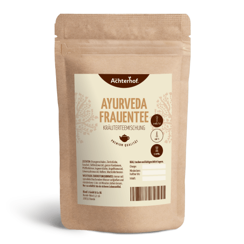 Ayurveda Frauentee vom Achterhof. Dieser Ayurveda Tee besticht besonders durch seinen weichen Geschmack Diese Komposition spricht gewiss nicht nur Frauen an. Schon beim Öffnen der Tüte steigt einem der würzige Duft von Wacholder und frischer Orange in die Nase. Ein sehr weicher und runder Geschmack, mit angenehmer Fenchel- und Zimtnote, verwöhnt den Gaumen. Auch optisch eine sehr anspruchsvolle Mischung! Diese vollmundige Komposition aus Orangenschalen, Zimtstücken, Fenchel, Süßholzwurzeln, Kardamom, Ingwer, Angelika- und Löwenzahnwurzeln, Nelken, Wacholderbeeren wird alle deine Sinne verführen. Gönne dir an manchen Tagen, einfach mal einen Genussmoment.