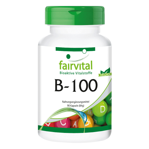 B-100 Kapseln von Fairvital. B-100 von Fairvital B-Vitamine gehören zu den wasserlöslichen Vitaminen, die beim Zellstoffwechsel eine wesentliche Rolle spielen. Wegen der Wasserlöslichkeit können sie mit dem Urin ausgeschieden werden. Dies ist ein Grund, weshalb auf eine regelmäßige Zufuhr geachtet werden sollte. Jedes B-Vitamin ist entweder ein Coenzym oder eine Vorstufe eines wichtigen Metabolismus, wie z.B. die Umwandlung der Kohlenhydrate, der Aminosäuren oder der Fettsäuren und sie spielen eine wichtige Rolle bei der Zellteilung. Alle B-Vitamine können außerdem zu einem normalen Energiestoffwechsel beitragen. Die Tabletten von Fairvital beinhaltet der Vitamin B-Komplex mit allen 8 B-Vitaminen. Schutzengel für dein Nervensystem!