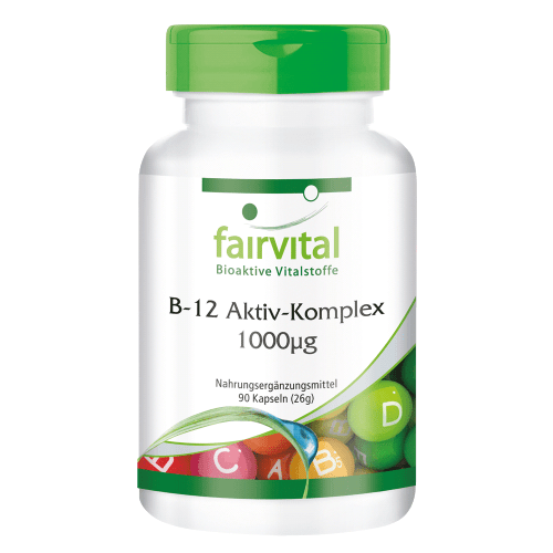 B-12 Aktiv-Komplex 1000µg Kapseln von Fairvital. B-12 Aktiv-Komplex 1000µg von Fairvital Das Vitamin B-12 Aktiv-Komplex ist hochdosiert und beinhaltet die bioaktive Formen von Vitamin B12. Vitamin B-12 hat viele Funktionen. Beispielsweise ist das Vitamin wichtig für das Nervensystem und die Psyche. Außerdem ist es gut gegen Müdigkeit und unterstützt einen normalen Homocystein Spiegel, etc. Nahrungsergänzungsmittel von Fairvital!