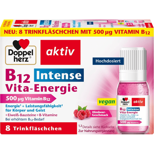 B12 Vita-Energie Trinkampullen Doppelherz. B12 Vita-Energie Trinkampullen (8x10ml) Vitamin B12 + Vitamin B6 + Niacin tragen bei: zur Verringerung von Müdigkeit und Erschöpfung zu einem normalen Energiestoffwechsel zu einer normalen Funktion des Nervensystems Die Energiespeicher gefüllt halten – mit gesunder Ernährung und Vitamin B12 Nicht nur im Winter, sondern auch im Frühling nach den dunklen Monaten fehlt es vielen Menschen an Energie. Viel Bewegung im Freien, eine gute Nährstoffversorgung durch die Ernährung und eine Extra-Portion Vitamin B12 unterstützen den Energienachschub. Insbesondere in stressigen Zeiten kommt die gesunde Ernährung oft zu kurz. So belastet z. B. fettiges Essen den Körper derart, dass für den Kopf nur bleierne Müdigkeit bleibt. Will man Energiefressern tatsächlich aus dem Wege gehen, empfiehlt es sich, die Ernährung in kleinen Schritten umzustellen. Schon mit einem Apfel täglich statt dem Schokoriegel oder einem frischen Salat anstelle einer Currywurst kann der Anfang gelingen. Vitamin B12 ist für unser Immunsystem wichtig, das in den Wintermonaten stark beansprucht wird. Außerdem trägt Vitamin B12 dazu bei, dass unseren Körperzellen die dringend benötigte Energie zur Verfügung gestellt wird, indem es den normalen Energiestoffwechsel unterstützt. Bei ausreichender Versorgung leistet es so einen Beitrag zur Verringerung von Müdigkeit und Erschöpfung. Nennenswerte Mengen an Vitamin B12 finden sich ausschließlich in tierischen Lebensmitteln. Vegetarier und Veganer nehmen über pflanzliche Lebensmittel keine ausreichenden Mengen an Vitamin B12 zu sich. Können Vegetarier ihren Bedarf noch durch Milchprodukte oder Eier decken, sollten Menschen, die sich vegan ernähren, ihre Ernährung jedoch durch Vitamin B12 ergänzen. Manche pflanzliche Lebensmittel wie etwa die Nori-Alge oder auch fermentierte Lebensmittel wie Sauerkraut enthalten zwar das Vitamin – jedoch nur in sehr geringen Mengen. Als empfindliches und wasserlösliches Vitamin kann B12 (Cobalamin) schon durch zu lange Lagerzeiten und beim Kochen zerstört werden. Der Umgang mit Lebensmitteln sollte also sehr schonend sein. Die meisten Vitamine können im Normalfall vom Darm direkt aufgenommen werden – die Ausnahme ist Vitamin B12: Um über die Darmschleimhaut ins Blut gelangen zu können, benötigt das B-Vitamin ein spezielles Eiweiß: den sogenannten Intrinsic Factor (IF). Mit fortgeschrittenem Alter produziert der Mensch natürlicherweise jedoch häufig weniger von diesem Eiweiß, sodass der Körper in der Folge immer weniger Vitamin B12 aufnehmen kann. Der mangelnde Intrinsic Factor wird als die häufigste Ursache einer unzureichenden Vitamin-B12-Versorgung angesehen. B12 Vita-Energie Trinkampullen (8x10ml) hat die PZN 11590654. Eine ausreichende Nährstoffversorgung spielt für die Gesundheit eine wichtige Rolle. Vitamin B12 kann unser Körper nicht selbst bilden. Somit muss es über die Nahrung aufgenommen werden. Doppelherz B12 Vita-Energie enthält 500μg Vitamin B12 in Kombination mit drei ausgesuchten B-Vitaminen und den Eiweißbausteinen L-Glutamin und L-Serin. Ein weiteres Plus des Multitalents ist das attraktive Preis-Leistungs-Verhältnis. B-Vitamine sind sehr empfindlich, wasserlöslich und sollten regelmäßig mit der Nahrung neu aufgenommen werden. Es trägt unter anderem zur Verringerung von Müdigkeit und Erschöpfung bei und unterstützt eine normale Funktion des Immunsystems. Vitamin B1 leistet einen Beitrag zum normalen Energiestoffwechsel. Es unterstützt außerdem die normale Herzfunktion und leistet auch einen Beitrag für die normale Funktion des Nervensystems.