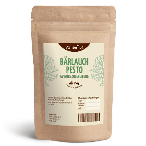 Bärlauch Pesto Gewürzzubereitung vom Achterhof. Pesto-Bärlauch Gewürzzubereitung: Den Frühling auf der Zunge Bärlauch ist ein absoluter Trend im Kräuterbereich. Geschmacklich erinnert er an Knoblauch, ist aber etwas milder als dieser. Doch die Parallelen sind unverkennbar, was dem Kraut auch den Beinamen „Wilder Knoblauch“ einbrachte. Es schmeckt wunderbar erfrischend, würzig und einfach nach Frühling. Und was passt besser zum Frühling, als ein leichtes Pastagericht? Mit unserer genialen Gewürzzubereitung bist du völlig flexibel und bereitest dir dein eigenes Bärlauch-Pesto blitzschnell zu. Einfach die Mischung mit Olivenöl und Parmesan verrühren und über die Pasta geben. Veganes Pesto ist mit diesem Gewürz ebenfalls kein Problem. Verzichte auf den Käse und rühre dir eine aromatische Kräutersoße an. Genauso, wie du sie magst. Übrigens schmeckt die Pesto Gewürzzubereitung nicht nur zu Nudeln hervorragend. Auch als frühlingsleichte Salatkräuter kannst du unser Produkt verwenden. Zum Beispiel zur Spargelzeit. Wenn die edlen Stangen Saison haben, ist auch gerade die Hauptzeit des wilden Knoblauchs. Probiere doch einmal einen knackigen Spargelsalat mit unserer Pesto-Bärlauch Gewürzzubereitung. Ein Traum! Und der perfekte Start für ein leichtes Frühlingsmenü. Natürlich schmeckt diese Zubereitung auch fernab der Bärlauch-Saison fantastisch. Unser Tipp: Zugreifen! Frische Pasta mit Pesto ist schon was Feines – wie wäre es, wenn du dieses einfach und schnell selber machen könntest? Mische unsere Bärlauch Pesto Gewürzzubereitung einfach mit etwas Olivenöl und etwas frisch geriebenem Parmesan und schon zauberst du dir ein frisches Pesto mit mild-würzigem Bärlauch! Natürlich kannst du auch feine Saucen oder ein leckeres Dressing für deine Salate damit kombinieren – Probiere es einfach aus!