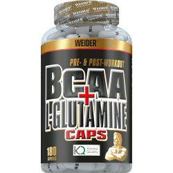 BCAA + L-Glutamine Kapseln von Weider. Weider – BCAA + L-Glutamin 3,6g BCAA + 3,6g Glutamin in der Tagesdosis liefern reichlich Aminosäuren für die Regeneration und den Muskelaufbau. BCAA + L-Glutamin Kapseln von Weider – Vorteile: hochwertige BCAA und L-Glutamin in hoher Dosierung Unterstützung beim Muskelaufbau und der Regeneration nach intensivem Training praktische Kapselform Dose enthält eine Monatsdosis Was beinhalten die BCAA + L-Glutamine Kapseln von Weider? Wie der Name schon erahnen lässt, handelt es sich bei den BCAA + L-Glutamine Caps um Kapseln mit den verzweigtkettigen und essentiellen Aminosäuren L-Leucin, L-Isoleucin und L-Valin im Verhältnis 2:1:1 und L-Glutamin. Dabei sind die BCAA mit 3600mg je Tagesdosis von 6 Kapseln und auch L-Glutamin mit 3600mg enthalten. Warum BCAA + L-Glutamine Kapseln? Diese Aminosäurenkombination bieten eine perfekte Nahrungsergänzung für den Muskelaufbau, den Schutz und die Regeneration der Muskeln. Die BCAA sind in besonderem Maße am Eiweißstoffwechsel beteiligt, liefern Energie und werden direkt im Muskel verarbeitet.L-Glutamin gehört zu den körpereigenen Aminosäuren, trägt zur Verringerung von Müdigkeit bei, ist an der Aminosäurensynthese, der Blutbildung und Zellteilung beteiligt und ebenso an zahlreichen weiteren Körperfunktionen. Wie werden die BCAA + L-Glutamine Caps verwendet? Du kannst 6 BCAA + L-Glutamine Kapseln pro Tag mit ausreichend Flüssigkeit einnehmen. An Trainingstagen solltest Du sie direkt nach dem Training verwenden. BCAA + L-Glutamine Kapseln – Optimal für deine Regeneration Diese BCAA + L-Glutamine Kapseln liefern pro Portion 3,6 g L-Glutamin sowie 3,6 g der essenziellen BCAAs im bewährten Verhältnis 2:1:1 (L-Leucin : L-Isoleucin : L-Valin). Da der Körper BCAAs nicht selbst produzieren kann, müssen sie über die Ernährung oder Supplemente aufgenommen werden. L-Glutamin wird als semi-essenzielle Aminosäure eingestuft, da der Bedarf unter intensiver körperlicher Belastung möglicherweise höher ist, als der Körper selbst herstellen kann.