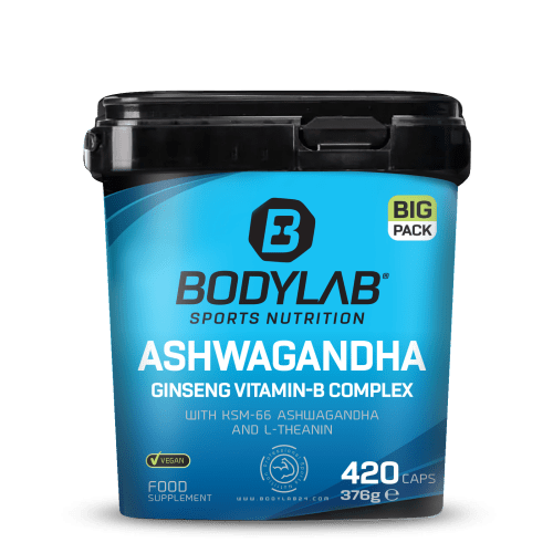 BIG PACK Ashwagandha Ginseng Vitamin-B Complex Kapseln von Bodylab24. Ashwagandha Ginseng Vitmin-B Complex Kapseln – jetzt im BIG PACK Zur täglichen Anreicherung der Ernährung. Einfach und problemlos zu schlucken, zu einem Zeitpunkt deiner Wahl. Profitiere mit der Einnahme von festen Bestandteilen der ayurvedischen Naturlehre, mit einem zusätzlichen Plus an B-Vitaminen und L-Theanin. Die Tagesdosis von 1 Kapsel enthält neben 325 mg Ashwagandha (KSM-66) zusätzlich Pflanzenextrakte aus Ginseng und Gingko biloba, dazu verschiedene B-Vitamine und L-Theanin. Was ist Ashwagandha? Ashwagandha, die botanische Bezeichnung lautet Withania somnifera, ist eine Pflanzenart. Bei uns ist sie eher unter dem Namen Schlafbeere, Winterkirsche oder indischer Ginseng bekannt. Sie zählt zur Familie der Nachtschattengewächse und ist mit Kartoffel und Tomate verwand. Die Früchte ähneln der Physalis, genutzt wird jedoch meist die Wurzel, die getrocknet zu Pulver verarbeitet wird und pur oder in Kapselform Verwendung findet. Warum Ashwagandha Ginseng Vitamin B Complex Kapseln Besonders in Indien hat die Nutzung von zahlreichen Pflanzenextrakten seit Jahrtausenden eine feste Tradition in der Naturheilkunde. Zu diesen zählen auch die enthaltenen Extrakte aus Ashwagandha, Ginseng und Gingko biloba. Unsere Ashwagandha Ginseng Vitamin-B Complex Kapseln enthalten KSM-66 Ashwagandha (325 mg je Tagesdosierung von 1 Kapsel), dazu die bereits erwähnten Pflanzenextrakte aus Ginseng und Gingko biloba + wichtige B-Vitamine und die Aminosäure L-Theanin. Ashwagandha zählt mittlerweile, wie einige andere Pflanzenextrakte, vielfach zum festen Bestandteil der täglichen Ernährung vieler intensiv trainierender Sportler. Da die Kapseln insbesondere für diese Gruppe entwickelt wurden, haben wir weitere, wichtige Nährstoffe für Sportler/innen zugefügt: Die B-Vitamine Riboflavin, Folsäure, Vitamin B6 und B12 sind an zahlreichen Stoffwechselvorgängen im Körper beteiligt, sind wichtig für das Nervensystem, das Immunsystem und viele andere körpereigene Prozesse. Das ebenfalls enthaltene L-Theanin wird aus Grüntee gewonnen und ist häufig in Energy Drinks und Pre Workouts zu finden. Ein Supplement für Alltag und Trainingsphasen. Das BIG PACK – Ashwagandha Ginseng Vitamin B Complex Kapseln (mit KSM-66®), zusätzlich angereichert mit L-Theanin und Gingko biloba. Als Zusatz zu einer normalen und ausgewogenen Ernährung mit wertvollen Pflanzenextrakten und wichtigen B-Vitaminen. Je Tagesdosierung, bestehend aus einer leicht zu schluckenden Kapsel, sind 325 mg Ashwagandha enthalten. Profitiere im Alltag und beim Sport von einem festen Bestandteil der ayurvedischen Naturlehre.