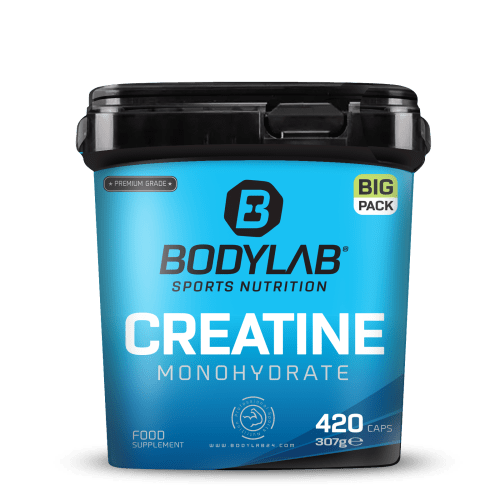 BIG PACK Creatine Monohydrate Kapseln von Bodylab24. Creatine Monohydrate Caps im BIG PACK Die Highlights: – je Tagesdosis (6 Kapseln) 3 g sehr gut verfügbares Kreatinmonohydrat in pharmazeutischer Qualität – leicht zu schlucken – Inhalt reicht für 60 Tagesdosierungen – Preisvorteil im BIG PACK Ab einer Einnahme von 3 g Kreatin pro Tag erhöht sich die körperliche Leistung bei Schnellkrafttraining im Rahmen kurzzeitiger intensiver körperlicher Betätigung. Dies wurde in zahlreichen Studien nachgewiesen. Für wen sind die Creatine Monohydrate Kapseln geeignet? Kreatin-Monohydrat Supplements sind besonders beliebt bei Kraftsportlern und Fitnessathleten, werden aber auch von zahlreichen anderen Sportlern, z.B. von Fußball-, Tennis-, Handballspielern oder Leichtathleten, in Kombination mit gezieltem Schnellkrafttraining verwendet. HINWEIS: Unter der Einnahme und Nutzung eines Kreatinsupplements kann es zu einer Gewichtszunahme kommen, unter anderem dadurch, dass der Körper vermehrt Wasser einlagert. Daher sollte über den Tag verteilt und beim Training auf eine ausreichende Flüssigkeitsversorgung geachtet werden. Nicht für Kinder & Jugendliche unter 18 Jahren, Stillende und Schwangere geeignet Warum Creatine Monohydrate Kapseln von Bodylab24? Die Kapseln enthalten neben Kreatinmonohydrat nur wenige, weitere Zusätze. In der Kapselform lässt es sich rund ums Training oder über den Tag verteilt einfach und unkompliziert einnehmen, zudem fällt es vielen Sportlern leichter, einige Supplements in Kapselform zu sich zu nehmen. Creatine Monohydrate Kapseln von Bodylab24 stellen also eine Alternative für alle Athleten dar, die Kreatin nicht nur oder gar nicht in reiner Pulverform verwenden möchten oder generell lieber auf Tabletten oder Kapseln zurückgreifen. Die Qualität des aufgenommenen Kreatins ist in beiden Versionen hochwertig und es kann vom Körper schnell verwertet werden. Das BIG PACK Kreatinmonohydrat in Kapselform – höchste Qualität für beste Performance.Jede Tagesdosis liefert 3g Kreatinmonohydrat. Kreatin unterstützt das Schnellkrafttraining bei kurzzeitigen, intensiven Belastungen. Nicht für Personen unter 18 Jahren geeignet.