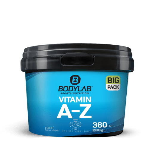 BIG PACK Vitamin A-Z Kapseln von Bodylab24. Das BIG PACK Vitamin A-Z Tabletten: Die einfache und umfassende Vitaminquelle für Sportler Die Vitamin A-Z Tabletten von Bodylab24 bieten kompakt und bequem 13 wichtige wasser- und fettlösliche Vitamine in Tablettenform. Ideal zur Ergänzung der täglichen Ernährung, insbesondere für aktive Sportler. Enthalten sind Vitamin A, E, K1, D3, C und verschiedene B-Vitamine wie Niacin, Thiamin, Pantothen- und Folsäure. Diese Tabletten sind frei von Aromen und Süßungsmitteln – nur pure Nährstoffkraft. Warum sind Vitamin Tabletten sinnvoll für Sportler? Vitamine sind lebensnotwendig und spielen eine Schlüsselrolle in zahlreichen Körperfunktionen. Besonders die B-Vitamine unterstützen den Energiestoffwechsel, was sie für Sportler, die an ihre Grenzen gehen, unentbehrlich macht. Sie fördern die normale Leistungsfähigkeit und wirken Ermüdung entgegen. Diese Nährstoffe sind ebenfalls essenziell für zahlreiche Stoffwechselvorgänge, das Nervensystem und stärken das Immunsystem. Die Vitamin A-Z Tabletten ersetzen nicht eine ausgewogene Ernährung, sondern sind als Ergänzung gedacht, um die tägliche Vitaminzufuhr zu optimieren. Pantothensäure trägt zu einer normalen geistigen Leistung bei. Vitamin A, B12, B6, C, D und Folsäure tragen zu einer normalen Funktion des Immunsystems bei. Riboflavin, Thiamin, Vitamin B12, B6, C, Biotin, Niacin und Pantothensäure unterstützen einen normalen Energiestoffwechsel. Niacin, Pantothensäure, Riboflavin, Vitamin B12, B6, C und Folsäure tragen zur Verringerung von Müdigkeit und Ermüdung bei. Riboflavin, Thiamin, Vitamin B12, B6, C, Biotin und Niacin fördern eine normale Funktion des Nervensystems. Optimiere deine Sportlerernährung mit den Bodylab24 Vitamin A-Z Tabletten – eine smarte Ergänzung für deinen Trainingserfolg! Entdecke das BIG PACK Vitamin A-Z, einen erstklassigen Multivitaminkomplex, der alle 13 wasser- und fettlöslichen Vitamine enthält.In Zeiten von hartem Training, Stress und unausgewogener Ernährung ist es entscheidend, deinen Körper mit den richtigen Nährstoffen zu versorgen. Unsere hochwertige Vitamin Formel wurde entwickelt, um deine Vitaminversorgung anzureichern und bei Bedarf zu optimieren. Ein Mangel an wichtigen Vitaminen kann die Gesundheit und allgemeine Leistungsfähigkeit beeinträchtigen. Vitamin A-Z ist eine einfache Lösung, um einen Mangel auszugleichen und deine normale Ernährung mit wichtigen Vitamnen anzureichern.