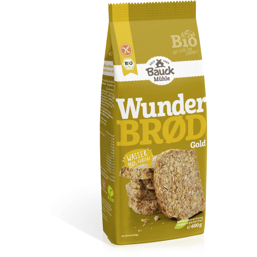 Bio Backmischung Wunderbrød Gold Bauckhof. Bio Backmischung Wunderbrød Gold von Bauckhof Bauckhof hat eine neue, feinere Brotbackmischung mit Kurkuma, Goldleinsaat und Goldhirse kreiert. Mit 46% Saaten ist sie weniger kernig als die anderen Wunderbrødmischungen, aber mit einem höheren Haferanteil. Auch sie kommt ohne Mehl, ohne Hefe und ohne Zuckerzusatz aus und ist zudem auch vegan und glutenfrei. Einfach Wasser zur Brotbackmischung geben, quellen lassen und im Backofen backen und genießen! Eco control number: DE-ÖKO-007 Eine perfekte Kombination aus Hafer und Saaten!