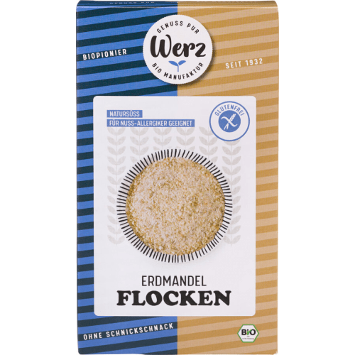 Bio Erdmandelflocken Werz. Bio Erdmandelflocken von Werz Die Bio Erdmandelflocken der Marke Werz sind aus feinen Bio-Erdmandeln hergestellt und sind somit natürlich glutenfrei und vegan. Dank ihrer wertvollen Inhaltstoffe und vielen Ballaststoffe sind die Erdmandelflocken ein tolles Frühstück oder ein leckerer Snack zwischendurch. Sie sind von Natur aus süß und schmecken auch solo einfach lecker. Die Bio Erdmandelflocken kannst du ganz einfach mit Milch oder Sojamilch in einer Schüssel anrühren. Auch zu Müsli oder süßem Frühstücksbrei sind die Flocken sehr gut geeignet. Wenn du es morgens einmal eilig hast, kannst du die Flocken auch einfach in Saft einrühren und fertig ist das schnelle Frühstück! Eco control number: DE-ÖKO-007 Leckerer Snack mit vielen wertvollen Ballaststoffen!