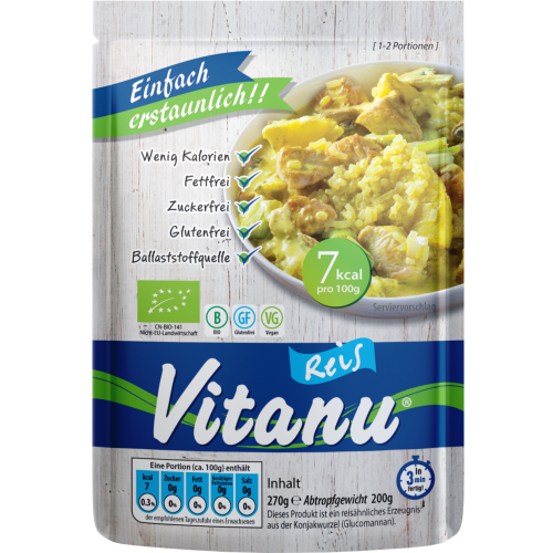 Bio Konjak auf Reis Art Vitanu. Was ist Bio Konjak auf Reis Art von Vitanu? Bio Konjak auf Reis Art von Vitanu ist eine fett- und glutenfreie Alternative zu herkömmlichem Reis und somit gerade für Menschen mit einer Glutenunverträglichkeit oder im Rahmen einer kalorienarmen Ernährung besonders zu empfehlen. Da er vorgekocht ist, lässt er sich einfach und schnell zubereiten und in jedem erdenklichen Reisgericht verwenden – der Kreativität und dem Genuss sind keine Grenzen gesetzt! Bio Konjak auf Reis Art kann für eine Vielfalt an klassischen und modernen Rezepten verwendet werden. Dazu das Wasser aus der Tüte abgießen, den Konjak Reis unter warmem Wasser abspülen und anschließend 2-3 Minuten in einer Pfanne erwärmen. Mit Fleisch, Fisch oder Gemüse anrichten und servieren. Eco control number: CN-BIO-141 Die leichte Reis-Alternative ohne Gluten!