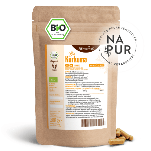 Bio Kurkuma Kapseln Nachfüllpack Kapseln von vom Achterhof. Bio Kurkuma Kapseln Die gelbe Wurzel – Entdecke das Potenzial der Natur Kurkuma hat viele Namen: „Gelbwurzel“, „Safranwurzel“ oder „Gelber Ingwer“. Letzteres kommt daher, dass Kurkuma eine Pflanze aus der Familie der Ingwergewächse ist und sie sich auch äußerlich sehr ähneln. Doch schon beim Aufschneiden unterscheidet sich Kurkuma vom bekannten Ingwer, denn der „Gelbe Ingwer“ leuchtet von innen intensiv gelb. Verantwortlich für diese intensive Färbung ist das enthaltene Curcumin, das vielen Currys eine wunderbare Farbe verleiht. Feines Bio Kurkuma Pulver in einer veganen Kapsel Kurkuma Kapseln vom Achterhof werden mit größter Sorgfalt mit 600 mg Bio Kurkuma Pulver gefüllt. In einem schonenden Verfahren wird die Kurkumawurzel getrocknet und gemahlen und das Pulver ohne Zusatz von Trennmitteln (wie z.B. Magnesiumstearat) und Füllstoffen hergestellt. Es ist ein Naturprodukt von höchster Qualität ohne jegliche Zusätze. Auch die Kapselhüllen bestehen aus zertifizierten, rein pflanzlichen Inhaltsstoffen (HPMC) und sind somit ideal für eine vegane Ernährung geeignet. Eco control number: DE-ÖKO-001 In der gelben Knolle, die vor allem aus der indischen Ayurveda-Lehre bekannt ist, steckt das Potenzial der Natur. Unsere veganen Bio Kurkuma Kapseln enthalten 600 mg naturreine, frisch vermahlene Kurkumawurzel aus kontrolliert biologischem Anbau. Ideal für unterwegs oder für alle, die ihre Portion Kurkuma immer griffbereit haben möchten. » Gibt es auch als Bio Kurkuma Pulver.