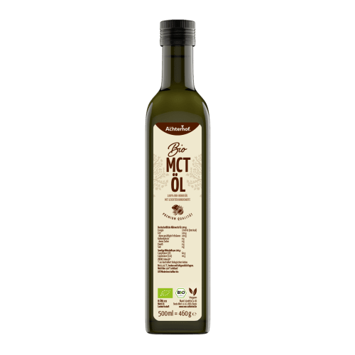 Bio MCT Öl vom Achterhof. MCT Öl – Das Öl mit hochwertigen mittelkettigen Fettsäuren MCT Öle enthalten medium-chain-triglycerides, sprich mittelkettigen Fettsäuren, die aus Ketten von 6 bis 12 Kohlenstoffatomen bestehen. Das hebt die hochwertigen MCT Öle von herkömmlichen Ölen ab, die einen höheren Anteil an langkettigen Fettsäuren haben. Mittelkettige Fettsäuren sind gesättigte Fettsäuren, die es so in reiner Form in der Natur nicht gibt, jedoch aber in tropischen Pflanzenfetten wie in Kokosfett vorkommen. Auch das MCT Öl vom Achterhof wird aus 100% Kokosöl gewonnen und ist damit rein pflanzlich. Merkregel: Umso kürzer die Kette der Kohlenstoffatome ist, umso besser. Die mittelkettigen Fettsäuren C8 und C10 Mittelkettigen Fettsäuren haben den Vorteil, dass sie im Gegensatz zu langkettigen Fettsäuren, vom Körper besser aufgeschlossen werden können, ganz ohne Gallensäure und fettspaltende Enzyme der Bauchspeicheldrüse. Zu den effektivsten mittelkettigen Fettsäuren gehören die Caprinsäure (C10) und die Caprylsäure (C8). Dabei ist die Caprylsäure die hochwertigste Form von MCT, da diese verstoffwechselt werden können und direkt Ketone bildet, welche essenziell für den Energiekreislauf sind. Dabei wird Glukose oder Fett verbrannt und in Energie umgewandelt. Die Einnahme von MCT Kokosöl Unser vom Achterhof Bio MCT Kokosöl ist geschmacks- und geruchsneutral und kann somit ganz einfach in Getränke und Speisen gemischt werden. Um davon profitieren zu können, sollte das MCT Kokosöl, wenn möglich morgens zu dir genommen werden. Wichtig zu beachten ist jedoch, dass du deinen Körper anfangs langsam an die Einnahme von MCT Öl heranführst und dementsprechend erst einmal mit einer geringen Dosierung von 1 Teelöffel pro Tag startest und es dann auf bis zu 3 Esslöffel pro Tag steigerst. Hier ein paar Beispiele wie du unser MCT Kokosöl verwenden kannst: Es kann mit in den morgendlichen Frühstücks Chia-Pudding, den Smoothie oder in den Bulletproof Coffee gegeben werden und ist damit die perfekte Unterstützung für den Start in den Tag. Bulletproof Coffee – Rezept: Der Bulletproof Coffee, ins Deutsche übersetzt „kugelsicherer Kaffee“, ist das ideale Heißgetränk für eine schnelle und einfache Alternative zum Frühstück. Denn er hat einen hohen Fett- und gleichzeitig niedrigen Kohlenhydratgehalt. Also optimal für eine ketogene oder auch kohlenhydratarme Ernährung. Zutaten für 1 Tasse: 200 ml frisch gekochter Kaffee 1 TL Bio MCT Kokosöl vom Achterhof 1 TL weiche Butter Optional: 0.5 TL Zimt Zubereitung: Bereite zuallererst einen frischen Kaffee vor. Gib dann alle Zutaten, einschließlich des Kaffees, in einen Mixer und mixe es so lange, bis eine cremige Konsistenz entsteht. In eine Tasse geben und genießen. Eco control number: DE-ÖKO-039 Für alle die sich ketogen ernähren, ist MCT ein Begriff. Es steht für medium-chain triglycerides und bedeutet, dass die MCT Öle mittelkettige Fettsäuren enthalten, was sie wiederum von herkömmlichen Ölen abhebt. Zu den effektivsten mittelkettigen Fettsäuren gehören die Caprin- und die Caprylsäure, wovon unser hochwertiges BIO MCT Kokosöl circa 60 % Capryl- und 40 % Caprinsäure pro 100g enthält. Tipp: Mit diesem hochwertigen MCT Kokosöl kannst du den idealen Bulletproof Coffee kreieren. Scrolle für das Rezept einfach nach unten.