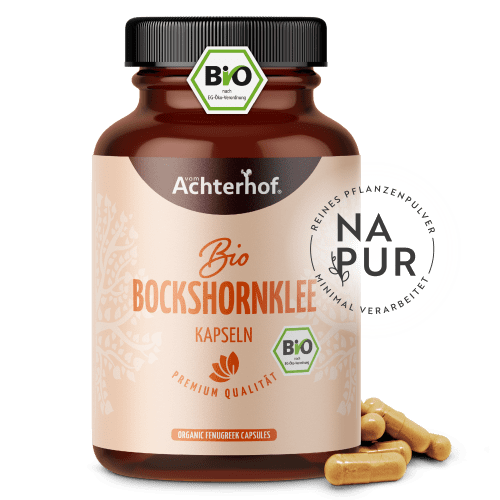 Bockshornklee Kapseln Bio Kapseln von vom Achterhof. Bockshornklee Kapseln in bester Bio-Qualität Hochwertiges Naturprodukt – Mit langer Tradition Der Bockshornklee verdankt seinem Namen seinem Aussehen. Er gehört zu den Schmetterlingsblütlern, genau wie der Schabzigerklee und hat hellviolette bis gelbe Blüten, aus welchen sich Hülsenfrüchte entwickeln. Diese länglichen Hülsen sehen aus wie die Hörner von Böcken, woher auch der Name Bockshornklee kommt. Weltweit ist er in der Küche ein beliebtes Gewürz und ist Bestandteil vieler asiatischer und indischer Gewürzmischungen. Aber auch die Südtiroler verwenden das aromatische Gewürz für Brotteig. Doch Bockshornklee ist nicht nur in der Küche zu finden und hat in Indien und Nordafrika bereits eine lange Tradition. Auch Hildegard von Bingen und Pfarrer Kneipp erwähnten die Pflanze und empfahlen sie zur innerlichen und äußerlichen Anwendung. Vegane Kapseln – 100% naturrein Die Bockshornklee Kapseln vom Achterhof kommen in bester Bio-Qualität, hergestellt in einem aufwendigen Verfahren . Du erhältst somit ein Naturprodukt höchster Güte. Pro Kapsel enthalten die veganen Kapselhüllen 0,5g Bio Bockshornklee Pulver und eignen sich somit ideal für eine einfache und schnelle Zunahme der wertvollen Inhaltsstoffe. Eco control number: DE-ÖKO-001 Bockshornklee ist vor allem auf Grund seines würzig-bitteren Geschmacks bekannt als Gewürz in indischen Currys sowie als Brotgewürz in Südtirol. Wie der Schabzigerklee gehört auch der Bockshornklee zu den Schmetterlingsblütlern und ist eine Pflanze, der sowohl Hildegard von Bingen als auch Pfarrer Kneipp Beachtung schenkten. Unsere BIO Bockshornklee Kapseln enthalten 0,5g Bockshornklee Pulver pro Kapsel.