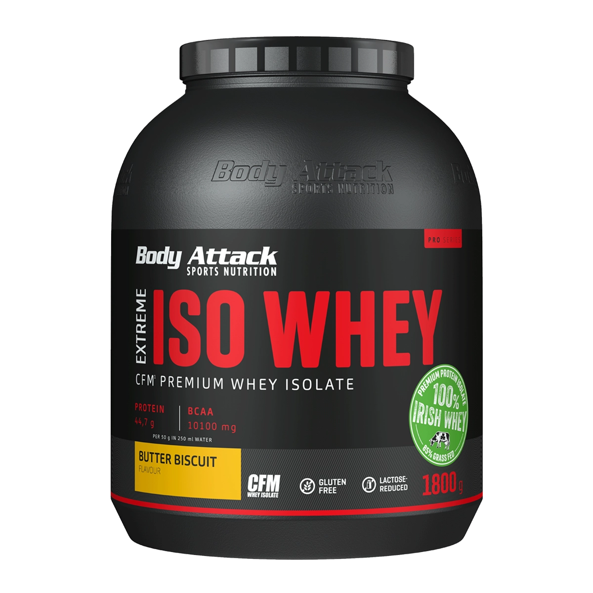 Iso Whey Protein aus echter Weidemilch! Mit Milch von Kühen, die Gras fressen und ihr Leben auf der Weide verbringen. Wo man das findet? Bei uns natürlich. Wir wissen, die beste Milch macht die besten Protein-Shakes. Und die beste Milch stammt aus artgerechter Weidehaltung in Irland! Das Ergebnis: das BODY ATTACK EXTREME ISO WHEY. Unser Premium-Eiweißpulver hat einen Isolat-Anteil von mehr als 90 Prozent, wird schonend hergestellt, ist laktosearm, aspartamfrei und hervorragend verträglich. Welches Whey Isolat mehr kann? Wahrscheinlich keins. Perfekt für dich und deine Ziele! Für diese Ziele ist das EXTREME ISO WHEY genau die richtige Wahl: Muskelaufbau Muskeldefinition Muskelerhalt Diät/Gewichtsabnahme Für wen das EXTREME ISO WHEY geeignet ist: Kraft- und Ausdauersportler, die ihre Muskeln stark beanspruchen Fitness-Sportler, die Protein-Engpässe nach dem Training verhindern wollen Figurbewusste, die während Diäten oder Ernährungsumstellungen Nährstoffmängel kompensieren wollen Menschen, die sich in Low-Carb- oder Low-Fat-Diäten befinden Sportler mit Laktoseintoleranz, die ein geeignetes Eiweißpulver suchen EXTREME ISO WHEY: DAS BESTE AUS IRISCHER WEIDEMILCH Unser Premium Whey Isolat wird aus der Milch von Kühen gewonnen, die fressen, was sie fressen sollen: nämlich frisches, saftiges Gras. Das ist gut. Für die Kühe und für dich! Milch von grasgefütterten Kühen enthält mehr Omega-3-Fettsäuren. Auf zusätzliches Kraftfutter – das mitunter Hormone enthält – und den Einsatz von Antibiotika kann bei artgerechter Weidehaltung verzichtet werden. Weidewirtschaft ist auch gut für den Boden. Irland verdankt seine immergrünen Weiden dem milden, regnerischen Klima. Die Kühe können fast das ganze Jahr draußen im Freien verbringen, Gras fressen und glücklich sein. Diese besonderen Bedingungen geben unserem EXTREME ISO WHEY Protein die unvergleichliche Qualität, die du schmeckst. Dafür steht unser Siegel Premium Protein Isolate 100 % Irish Whey. ISO WHEY PROTEIN HAT BESTWERTE IN DEN NUTRITION-FACTS Unser Iso Whey Protein erzielt in allen Tests Bestwerte. Dafür sorgt die Kombination aus irischer Milch von grasgefütterten Kühen und schonende Herstellungsverfahren. Das EXTREME ISO WHEY überzeugt mit einem Isolat-Anteil von mehr als 90 Prozent. Pro Portion liefert das Iso Whey Protein also rund 44 g Eiweiß aus Whey-Protein Molkeneiweiß , etwa 2 g Kohlenhydrate und nur 0,5 g Fett. Der BCAA-Anteil liegt bei knapp 10.000 mg, der Glutamin-Anteil bei rund 7.600 mg pro Portion.* Der hohe Anteil an essenziellen Aminosäuren und Proteinen macht unser Whey-Protein zum idealen Eiweißprodukt nach intensiven Trainingseinheiten. QUALITÄT DURCH INNOVATION Wir erhalten mit modernster Technik das Beste der Natur. Unser spezielles und hochdosierztes Whey Isolat wird mit der sogenannten Cross-Flow-Microfiltration-Technik kurz CFM-Technik aus natürlicher irischer Molke gewonnen. Durch dieses rohstoffschonende Verfahren bleibt die ursprüngliche Nährstoffzusammensetzung von Milch aus Weidehaltung erhalten – und damit auch die wertgebenden Inhaltsstoffe und der natürliche Geschmack. Dadurch können wir ein Eiweißpulver herstellen, das mehr als 90 % Isolat-Anteil in seiner reinsten Form enthält – deutlich mehr als vergleichbare Produkte. Ein weiterer Pluspunkt unseres Iso Whey Proteins: Kohlenhydrate und Fette verschwinden quasi komplett. Aufgrund des niedrigen Laktosegehalts von etwa 0,4 g pro Portion eignet sich unser EXTREME ISO WHEY für Sportler mit Laktoseintoleranz. Glutenfrei ist unser Eiweißpulver übrigens auch. Und auf Aspartam verzichten wir bei unserem Premium-Produkt sowieso. Das ist Qualität, die man spürt und schmeckt! Iso Whey Protein ist ideal für den Muskelaufbau Du bekommst hochwertiges Molkenprotein-Isolat für effizienten Muskelaufbau. Schnelle Verfügbarkeit von Iso Whey Unser Iso Whey Protein ist die perfekte Eiweißquelle nach dem Training. Kein anderes Eiweiß landet so schnell dort, wo es sein soll: in deinen Muskeln. 100 % Irish Whey Unser Premium EXTREME ISO WHEY aus bester Milch und modernem Produktionsverfahren. PERFEKT NACH DEM TRAINING: EXTREME ISO WHEY Iso Whey ist die perfekte Eiweißquelle nach dem Training. Kein Eiweiß landet so schnell dort, wo es sein soll wie ein Isolat. Wenn deine Muskeln nach Protein lechzen, ist es sofort verfügbar. Das macht das EXTREME ISO WHEY zum idealen Muskelaufbau-Produkt. Außerdem ist unser Isolat sehr gut verträglich. Das Iso Whey ist in Wasser und Milch löslich und in verschiedenen köstlichen Sorten verfügbar. Kölner Liste® – Sicher, Sauber, Stark! Du willst volle Power, aber auf Nummer sicher? Dann check unsere Produkte auf der Gütesiegel der Kölner Liste®! Die Kölner Liste ist DIE Plattform für geprüfte Sportnahrung, die auf verbotene Substanzen getestet wurden. Keine versteckten Risiken, keine bösen Überraschungen – nur pure Performance. Egal ob Supplements, Snacks oder Drinks: Was hier gelistet ist, wurde unabhängig geprüft und gibt dir das gute Gefühl, alles richtig zu machen und clean zu trainieren. Viele unserer Produkte tragen dieses Siegel mit Stolz. Und es kommen immer mehr Neue dazu! * Angaben beziehen sich auf die Geschmacksrichtung Vanille und eine Portion Iso Whey 50 g Pulver in 250 ml Wasser . *Werte am Beispiel Vanilla / Alle weiteren Geschmacksrichtungen durchlaufen den gleichen Produktionsprozess und unterscheiden sich lediglich im Geschmacksaroma, sind jedoch nicht auf der Kölner Liste gelistet.