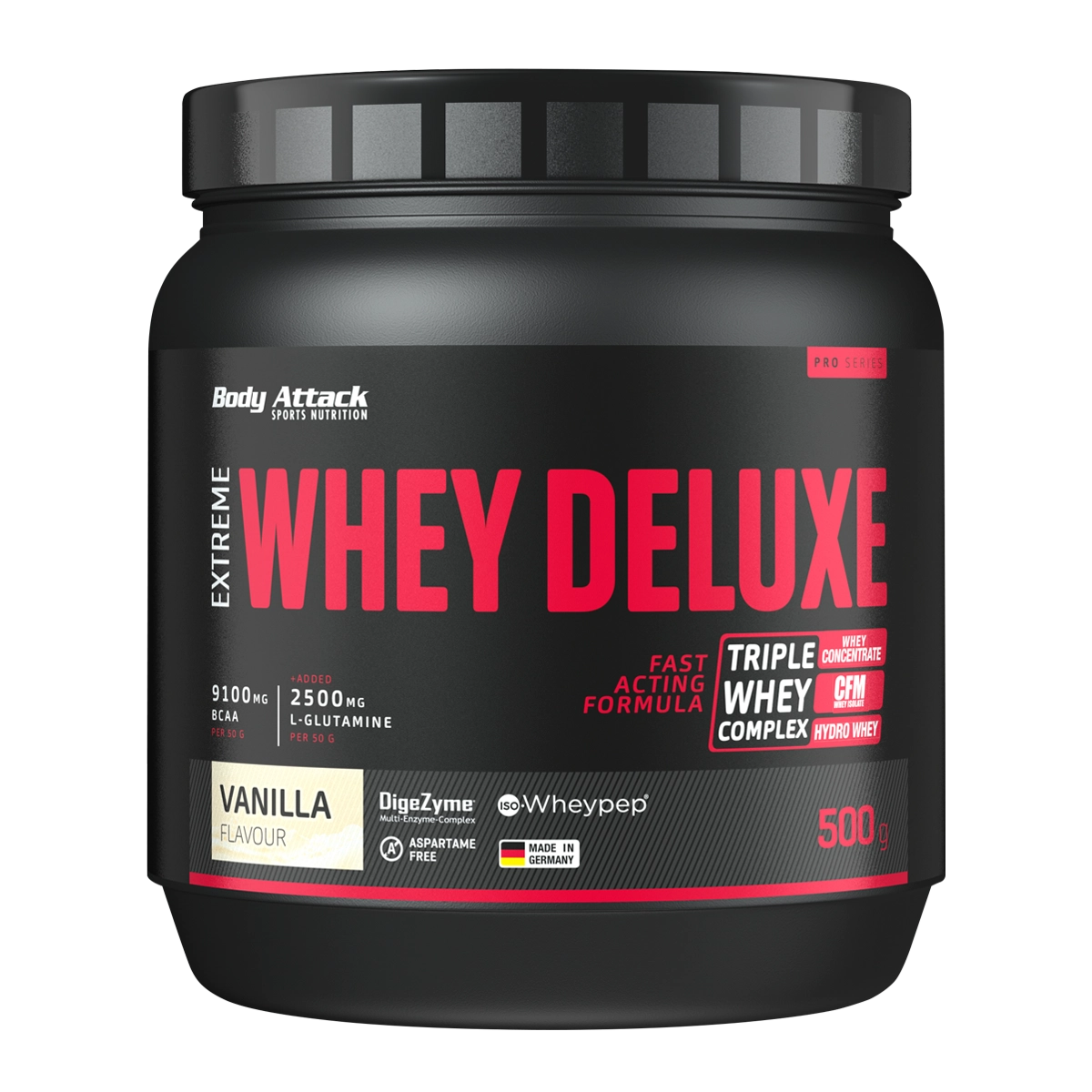 Starkes Proteinpulver für Muskeln Deluxe! Dein Körper braucht das Besondere: unser hochwertiges EXTREME WHEY DELUXE aus über 12 Jahren Entwicklung. Die Triple-Whey-Formel stellt dir die starke Kombination aus 84 Prozent hervorragend verwertbarem Eiweiß zur Verfügung. Schneller, effizienter, besser! Durch den Zusatz von DigeZyme® wird eine deutlich schnellere Nährstoffaufnahme und bestmögliche Verträglichkeit gewährleistet. Die ganze Nährstoff-Kombi ist selbstverständlich aspartamfrei, Low Sugar und Low Fat. Neun Geschmäcker verwandeln dein Wasser oder deine Milch in einen cremigen EXTREME WHEY DELUXE Proteinshake – der auch deinen Muskeln schmeckt. EXTREME WHEY DELUXE – Erreiche Deine Ziele Zur Unterstützung der folgenden Ziele ist das EXTREME WHEY DELUXE die perfekte Wahl: Muskel-Definition Muskelaufbau und Muskelerhalt Deckung eines erhöhten Proteinbedarfs Low-Carb und Low-Fat Diäten Für wen ist EXTREME WHEY DELUXE geeignet? Fitness-Sportler Athleten Ausdauer- und Spielsportler Figurbewusste Personen und Diätwillige Personen mit Proteindefizit EXTREME WHEY DELUXE: DEIN MUSKEL- UND ORGANANTRIEB Klar ist, ohne Eiweiß geht bei uns gar nichts! Denn Proteine oder auch Eiweiß genannt sind an der Stabilisierung von Gewebe, Organen und unserem Immunsystem beteiligt. Wie viel Eiweiß darfst du über die Nahrung aufnehmen bzw. hilft dir beim Ziel Muskelaufbau? Die „International Society of Sports Nutrition“ empfiehlt pro Tag 1,6 bis 2 Gramm pro Kilogramm Körpergewicht. Bei einem 80 kg schweren Mann wäre der Eiweißbedarf bei 160 g aufs Maximum gedeckt. TRIPLE WHEY COMPLEX – DER DREIFACH PROTEIN-TURBO Zunächst zur Begriffsklärung: „Whey“ ist der englische Begriff für Molke. Beim Whey Protein handelt es sich um ein Molkeneiweiß. Unser Whey ist das „Deluxe“ unter den Eiweißen mit der richtigen Protein-Mischung. Bei der Herstellung unserer Eiweiße zünden wir den Dreifach-Turbo. Das Ergebnis: Ein reines Pulver mit hervorragender Werte-Bilanz und Inhaltsstoffen, die für sich sprechen. Das ist EXTREME WHEY DELUXE! SO FUNKTIONIERT DIE FORMEL VOM EXTREME WHEY DELUXE 1. Das nährstoffschonende Cross-Flow-Microfiltration-Verfahren kurz CFM garantiert extrem hochwertiges und reines CFM Whey Protein Isolat. Kohlenhydrate und Fette werden weitestgehend reduziert. Das Ergebnis: Sehr hoher Proteinanteil und eine Aminosäurebilanz mit Bestnoten. 2. Das Mehrkomponenten-Molkeprotein liefert biologisch hochwertiges Whey Protein Konzentrat mit allen essenziellen Aminosäuren, die der Körper nach harten Trainingseinheiten benötigt, um Aufbau und Erhalt von Muskelproteinen zu unterstützen. 3. Molkenprotein-Hydrolysat liefert kleinste Proteinketten Peptide die schneller vom Körper aufgenommen werden und eine beschleunigte Nährstoffversorgung im Muskelgewebe sichern. EXTREME WHEY DELUXE liefert bis zu 84 % Protein*, gepaart mit einer sehr hohen biologischen Wertigkeit 104 und einem idealen Verteilungsverhältnis der Aminosäuren. DIGEZYME® SEI DANK! EIWEISS NOCH SCHNELLER IN DEINEN MUSKELN Du möchtest schnelles Protein für deine hart erarbeitete Muskulatur? Das enthaltene Whey Protein und DigeZyme® ergänzen sich hierfür hervorragend. Was das ist? Die neue und innovative Zusammensetzung diverser Enzyme zur Unterstützung der körpereigenen Nährstoffverarbeitung. Dadurch werden die Nährstoffe von deinem Körper schneller aufgenommen und sind besser verträglich. Die Spaltung der Proteine in Aminosäuren bewirkt eine optimale Versorgung mit diesen wichtigen Muskelbausteinen und führt zu einer Steigerung der Proteinbildung in deinen Körperzellen. Unser bestes Proteinpulver WHEY EXTREME DELUXE eignet sich ideal als Eiweiß-Shake nach dem Training. EXTREME WHEY DELUXE MIT BCAA‘S – DIE MUSKELMACHER Eiweiß versorgt den Körper mit essentiellen Aminosäuren, die er für den Aufbau von Muskeln braucht. Sie könnten deswegen auch die drei Musketiere der Muskelerhaltung heißen. Stattdessen hören sie auf die Namen Leucin, Isoleucin und Valin. Genau diese BCAA’s branched chain amino acids oder auch Aminosäuren genannt, erfüllen zahlreiche lebenswichtige Funktionen im menschlichen Stoffwechsel und sind wichtiger Bestandteil der Muskeln. Diese können wir lediglich über die Nahrung aufnehmen. Besonders Leucin kurbelt den Muskelaufbau an. Deshalb findest du im EXTREME WHEY DELUXE davon einen höheren Anteil, im idealen Mischverhältnis von 2:1:1 Leucin zu Valin zu Isoleucin . Genau diese Ration ist ideal für die Förderung deiner Muskeln. WERTVOLLE VITAMINE UND ANTIOXIDANZIEN Zusätzliche Vitamin-Power! Vitamine haben für den Körper und Organe zahlreiche lebenswichtige Funktionen. Deshalb sind sie für uns essenzielle Stoffe. Die kommen bei uns auch nicht zu kurz. Das EXTREME WHEY DELUXE ist vollgepackt mit insgesamt acht B-Vitaminen, die den Protein- und Fettstoffwechsel unterstützen. Damit werden alle Nährstoffe optimal um- und aufgebaut. Vitamin B6 ist für die Neubildung von Körper- und Muskelproteinen ein genialer Unterstützer. Das enthaltene Vitamin C hält dein Immunsystem auf Trab und schützt vor oxidativen Stress, genauso wie das Vitamin E. Die wertvolle Ladung an Vitaminen und Antioxidantien rundet das Eiweißpulver ab. Unser EXTREME WHEY DELUXE lässt dich stark ins nächste Workout starten! Wheypep – schnellstes Whey Hydrolysat für maximale Regeneration Wheypep ist ein hochentwickeltes Molkenprotein (Whey Hydrolysat), das speziell für Sportler und Fitnessenthusiasten entwickelt wurde, die ihre Muskeln nach dem Training optimal versorgen möchten. Durch die Aufspaltung in kurze Peptide wird das Protein besonders schnell vom Körper aufgenommen, wodurch die essenziellen Aminosäuren direkt den Muskeln zur Verfügung stehen. So unterstützt Wheypep nicht nur die schnelle Regeneration, sondern auch den Muskelaufbau, die Leistungsfähigkeit und die Reduzierung von Muskelkater nach intensiven Workouts. Anders als herkömmliches Whey-Protein ist 