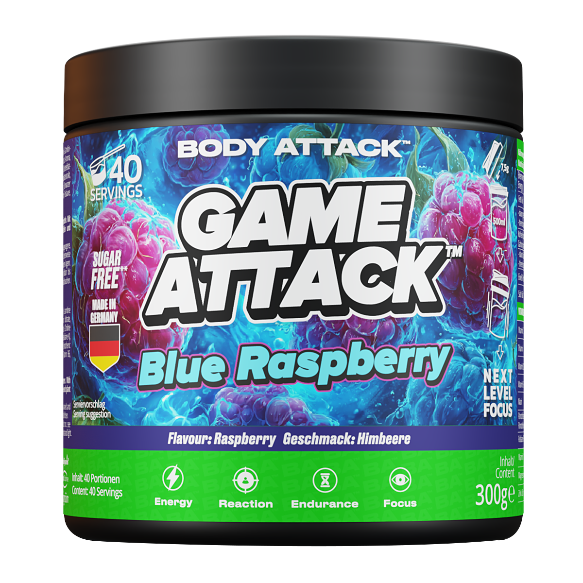 Wir begrüßen eine neue Produktsparte bei BODY ATTACK. Nach fast zwei Jahren, unzähligen Abstimmungsrunden und vielen Tests, Erprobungen und Erfolgen haben wir nun endlich die finale Version unseres Gaming Boosters für dich erschaffen können. Alles ist anders und doch sehr vertraut. Wir haben bei Null angefangen und können dir nun nicht nur wissenschaftsbasierte Benefits durch unsere 20 aktiven Inhaltsstoffe geben wir haben auch zehn Nootropics in unserer Formel verankert, um dir auch vor und nach dem Match Vorteile gegenüber deinem alten Ich zu verschaffen. GAME ATTACK – Die Revolution unter den Gaming-Boostern! Für die Unterstützung folgender Ziele GAME ATTACK ideal: Für kognitive Leistung in kompetitiven Szenarien Für maximale Konzentration und Fokus* Höchste Leistungsbereitschaft Für wen ist GAME ATTACK geeignet? Ambitionierte Gamer Für wahre Performer aller Art Leistungsorientierte Turnierteilnehmer Champions und die, die es werden wollen Ab jetzt und für immer: Gaming Booster ist GAME ATTACK! GAME ATTACK lässt dich nicht im Stich. Bei Turnieren und Matches bist du in Höchstform, beim Lernen voll konzentriert und wenn du besonders viel Fokus und Aufnahmefähigkeit brauchst, sind wir mit unserem Booster für dich da. Getestet durch die erfolgreiche E-Sport Orga Unicorns of love, geprüft durch externe Gutachter, verifiziert durch Studien und schlussendlich durch den Anspruch an uns selbst und an unseren eigenen Produkten abgesichert. Die Basis von GAME ATTACK baut auf die bewährte und bekannte Kombination aus Koffein, Vitaminen und Mineralstoffen auf. Unsere Ernährungswissenschaftler haben dieser erprobten Basis noch weitere Inhaltsstoffe hinzugefügt, die deine geistige Verfassung und Reflexe lang- sowie kurzfristig verbessern. Neben diesen gängigen Themen sind Punkte wie Müdigkeit und Erschöpfungserscheinungen im Entwicklungsprozess ein maßgeblicher Antrieb für die Abschaffung des Koffein-Crashs gewesen. Unsere Formel ist darauf optimiert, dass die Wirkung von GAME ATTACK schnell bemerkbar und das Hoch möglichst weit hinausgestreckt ist. Du kannst also über einen großen Zeitraum dein volles Potenzial ausschöpfen und dich darauf verlassen, dass der Cool-Down nur langsam und behutsam eintritt. So vermeiden wir, dass du schlagartig nach einem Hoch Kopfschmerzen, Stimmungsschwankungen und Konzentrationsschwierigkeiten bekommst. Um dir diese Benefits zu geben, verwenden wir eine natürliche und besonders hochwertige Variante des Grüntee-Extraktes L-Theanin. Unter dem Namen NeuroTeyanin bekannt, hilft dir dieser Wirkstoff GABA – einen Neurotransmitter – freizusetzen. Dadurch wird die Cool-Down-Phase verlängert und dein Körper auf das Abklingen der aktiven Inhaltsstoffe vorbereitet. Entgegen der oft zitierten Meinung, dass Kohlenhydrate in einem Booster keine Verwendung haben, wissen wir, dass manche Wirkstoffe ohne sie nicht dort ankommen, wo sie landen und wirken können. Deswegen verwenden wir in geringen Maßen unterschiedliche Kohlenhydrate und Zucker. Zusätzlich sind sie eine schnell verfügbare Energiequelle, die wir nutzen, um die Wirkung des Boosters zu beschleunigen. Unsere verwendeten Vitamine und Mineralstoffe unterstützen deine geistige und körperliche Leistung.** D- und B-Vitamine helfen dir beim Zusammenspiel von Muskulatur und Nervensystem, sind für die Bildung von Neurotransmittern zuständig und verringern somit aktiv deine Müdigkeit. Durch Zink und Magnesium profitierst du von einem gesteigerten Fokus, erhöhter Leistungsfähigkeit und schützt zusätzlich dein Nervensystem. Ein seit Jahrhunderten bewährtes Naturheilmittel hat es ebenfalls in unsere Formel geschafft. Bacopa Monnieri auch als kleines Fettblatt bekannt, wird bis heute als Nootropic verwendet und ist ein Garant für die verbesserte Leistungsfähigkeit deines Gehirns. Es unterstützt kurz- und langfristig dein Gedächtnis sowie die Lern- und Denkleistung, da es die Neubildung von neuronalen Verknüpfungen anregt. Darüber hinaus hat Bacopa Monnieri blutdruckregulierende Eigenschaften und bildet nicht nur neue Zellen, sondern schützt diese zusätzlich.*** * Koffein hilft die Konzentration und Aufmerksamkeit zu verbessern. **Vitamin C trägt dazu bei, die Zellen vor oxidativem Stress zu schützen / Vitamin C trägt zu einem normalen Energiestoffwechsel bei / Vitamin C trägt zur normalen psychischen Funktion bei / Vitamin B12 trägt zu einer normalen Funktion des Nervensystems bei / Vitamin B12 trägt zur normalen psychischen Funktion bei / Vitamin B12 trägt zur Verringerung von Müdigkeit und Ermüdung bei / Vitamin B6 trägt zu einem normalen Energiestoffwechsel bei / Vitamin B6 trägt zu einer normalen Funktion des Nervensystems bei / Vitamin B6 trägt zúr normalen psychischen Funktion bei / Vitamin B6 trägt zur Verringerung von Müdigkeit und Ermüdung bei / Magnesium trägt zur Verringerung von Müdigkeit und Ermüdung bei / Magnesium trägt zu einem normalen Energiestoffwechsel bei / Magnesium trägt zu einer normalen Funktion des Nervensystems bei / Magnesium trägt zur normalen psychischen Funktion bei / Zink trägt dazu bei, die Zellen vor oxidativem Stress zu schützen / Zink trägt zu einer normalen kognitiven Funktion bei ***Bacopa Monnieri Informationen basierend auf die aktuelle Studienlage.