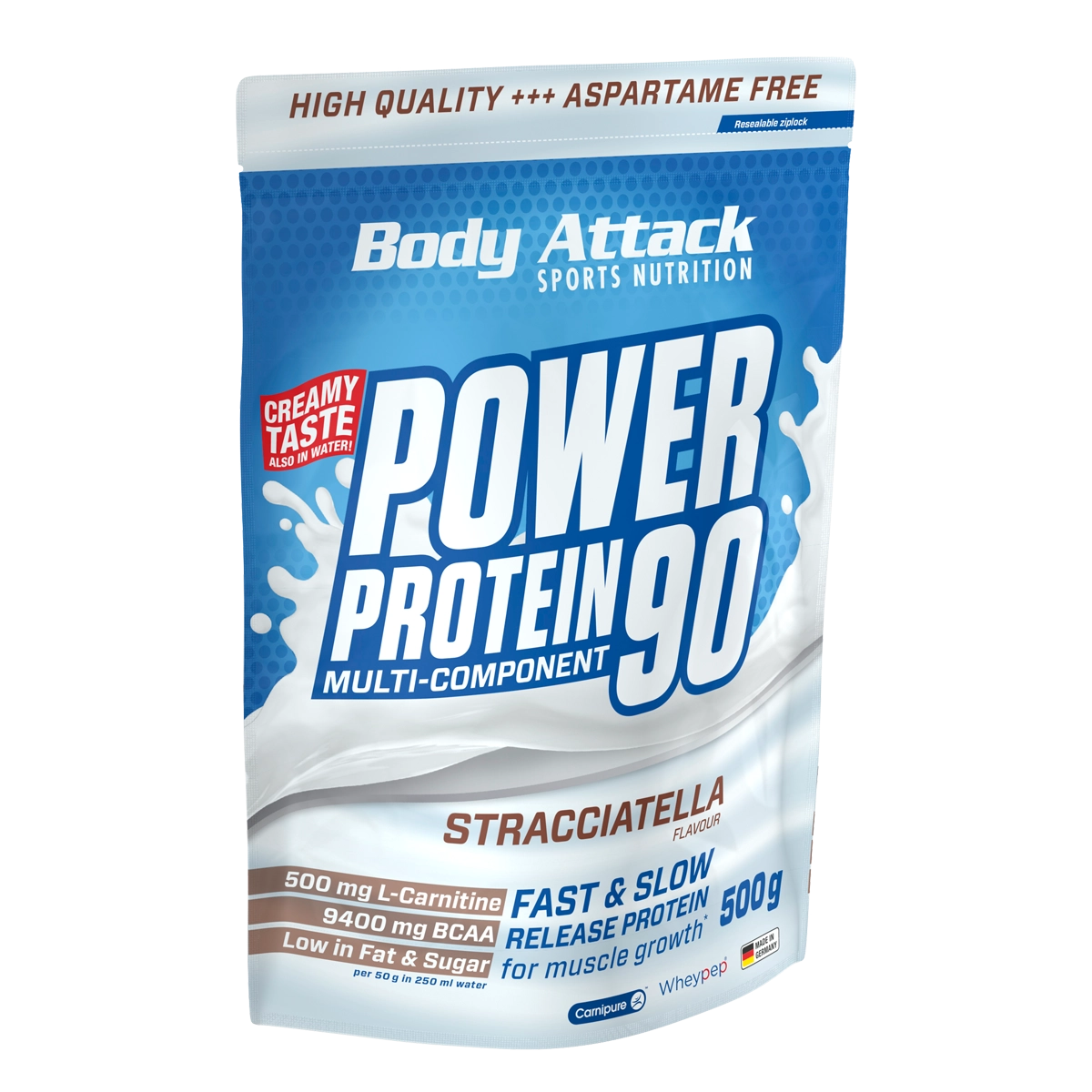 Shootingstar. Alleskönner. Lieblingsprotein! Das Super-Eiweiß für jede Sportart. Die Rede ist vom besten POWER PROTEIN 90 aller Zeiten. Das BODY ATTACK 5K Protein überzeugt auf ganzer Linie. Perfekt aufeinander abgestimmte Eiweißkomponenten unterstützen dich bei deinen Zielen. Mehr als 85 Prozent Eiweiß aus Whey-, Casein- und Egg-Protein, BCAA und L-Carnitin sowie jede Menge Vitamine sind bei unserem Eiweißpulver Standard. Das hört sich aufregend an? Stimmt. Das POWER PROTEIN 90 ist der perfekte Begleiter. Für dich, für jeden. Jederzeit. Für diese Ziele ist das POWER PROTEIN 90 genau die richtige Wahl: Muskelaufbau und -definition Muskelerhalt Diät Zwischenmahlzeit oder Snack Für wen ist der POWER PROTEIN 90 geeignet: Kraft-, Ausdauer- und Fitness-Sportler Figurbewusste, die fettarme Shakes suchen Für alle, die auf leckere und gesunde Drinks stehen DAS BESTE FÜR JEDES TRAINING: POWER PROTEIN 90 Du bist auf der Suche nach dem perfekten Eiweißpulver und plötzlich tauchen all diese Fragen auf. Wie viel Whey-Protein soll enthalten sein? Muss es Isolat sein oder eher ein Konzentrat? Was ist das überhaupt und ist Casein dabei tatsächlich wichtig? Mit L-Carnitin oder ohne, zusätzliche Vitamine ja oder nein? Wir helfen dir, die Entscheidung zu treffen: Unser POWER PROTEIN 90 ist garantiert das richtige Eiweißpulver für dich! Denn das BODY ATTACK 5K Mehrkomponenten Protein setzt sich aus fünf unterschiedlichen Eiweißquellen zusammen. Dabei sind die verschiedenen Proteine perfekt aufeinander abgestimmt. Den Spagat zwischen schnell verfügbarem Eiweiß und anhaltender Muskelversorgung schaffen wir mit hochwertigem Whey- und Casein-Protein. Egg-Protein vervollständigt das Aminosäureprofil und sorgt für höchste biologische Wertigkeit. Das macht unseren „All in One“-Proteinshake zum perfekten Allrounder! POWER PROTEIN 90 MIT WERTVOLLEN ZUSATZKOMPONENTEN Die verschiedenen Proteinquellen garantieren eine ideale Bioverfügbarkeit und ein hervorragendes Aminosäureprofil. Der hohe Anteil an BCAA im POWER PROTEIN 90 hat es in sich: Pro Portion liefert unser Eiweißshake ganze 9.900 mg BCAA* – ideal für deine Muskeln! POWER PROTEIN 90 enthält zudem zehn wichtige Vitamine, darunter B-Vitamine, Vitamin C und Vitamin E. Zusammen mit dem hervorragenden Proteinprofil ist dein Körper top versorgt. Unterwegs. Im Training. Im Alltag. Unser POWER PROTEIN 90 kann aber noch mehr! Neben wertvollen Vitaminen steckt in jeder Sorte des POWER PROTEIN 90 auch L-Carnitin aus patentiertem Carnipure™. L-Carnitin ist ein vitaminähnlicher Stoff, der dich beim Shape-Workout unterstützt. Die vielen Features hören sich aufregend an? Stimmt. Also warte nicht länger und schnappe dir unseren Alleskönner! WAS IST NOCH VON POWER PROTEIN 90 ZU ERWARTEN? Unser POWER PROTEIN 90 ist aspartamfrei. Außerdem legen wir viel Wert darauf, dass unser Produkt in Deutschland hergestellt wird. Für beste Qualität bei Rohstoffen und Verarbeitung. Shake it, Baby! Das POWER PROTEIN 90 schmeckt köstlich in Milch oder Wasser. Den cremigen Geschmack bei hervorragender Löslichkeit garantieren wir auch, wenn du unser Proteinpulver in Wasser mixt. So sparst du dir Kalorien und kannst auch dort, wo du keine Milch kühl aufbewahren kannst, deinen powervollen Shake genießen. Wheypep – schnellstes Whey Hydrolysat für maximale Regeneration Wheypep ist ein hochentwickeltes Molkenprotein (Whey Hydrolysat), das speziell für Sportler und Fitnessenthusiasten entwickelt wurde, die ihre Muskeln nach dem Training optimal versorgen möchten. Durch die Aufspaltung in kurze Peptide wird das Protein besonders schnell vom Körper aufgenommen, wodurch die essenziellen Aminosäuren direkt den Muskeln zur Verfügung stehen. So unterstützt Wheypep nicht nur die schnelle Regeneration, sondern auch den Muskelaufbau, die Leistungsfähigkeit und die Reduzierung von Muskelkater nach intensiven Workouts. Anders als herkömmliches Whey-Protein ist Wheypep leicht verdaulich, belastet den Magen nicht und kann auch direkt nach dem Training oder in stressigen Trainingsphasen eingesetzt werden, wenn die Muskeln besonders schnell Nährstoffe benötigen. GOODBYE LANGWEILIGE SORTEN, HALLO POWER PROTEIN 90 Es kann nur eine geben? Nicht bei uns. Unser POWER PROTEIN 90 erlaubt mehrgleisiges Genießen. Neben den Klassikern Erdbeere, Schokolade und Vanille fahren wir mit Butter-Biskuit, Pistazie, Cookies ´n Cream, Kokosnuss, Milchreis, Blaubeere-Joghurt und vielen weiteren köstlichen Sorten richtig dick auf – und verschlagen dir garantiert die Sprache. Natürlich sind alle Sorten in Wasser wie in Milch gleichermaßen easy aufzulösen! Kölner Liste® – Sicher, Sauber, Stark! Du willst volle Power, aber auf Nummer sicher? Dann check unsere Produkte auf der Gütesiegel der Kölner Liste®! Die Kölner Liste ist DIE Plattform für geprüfte Sportnahrung, die auf verbotene Substanzen getestet wurden. Keine versteckten Risiken, keine bösen Überraschungen – nur pure Performance. Egal ob Supplements, Snacks oder Drinks: Was hier gelistet ist, wurde unabhängig geprüft und gibt dir das gute Gefühl, alles richtig zu machen und clean zu trainieren. Viele unserer Produkte tragen dieses Siegel mit Stolz. Und es kommen immer mehr Neue dazu! *Angaben beziehen sich auf die Geschmacksrichtung Vanille pro Portion 50 g Pulver in 250 ml Wasser.