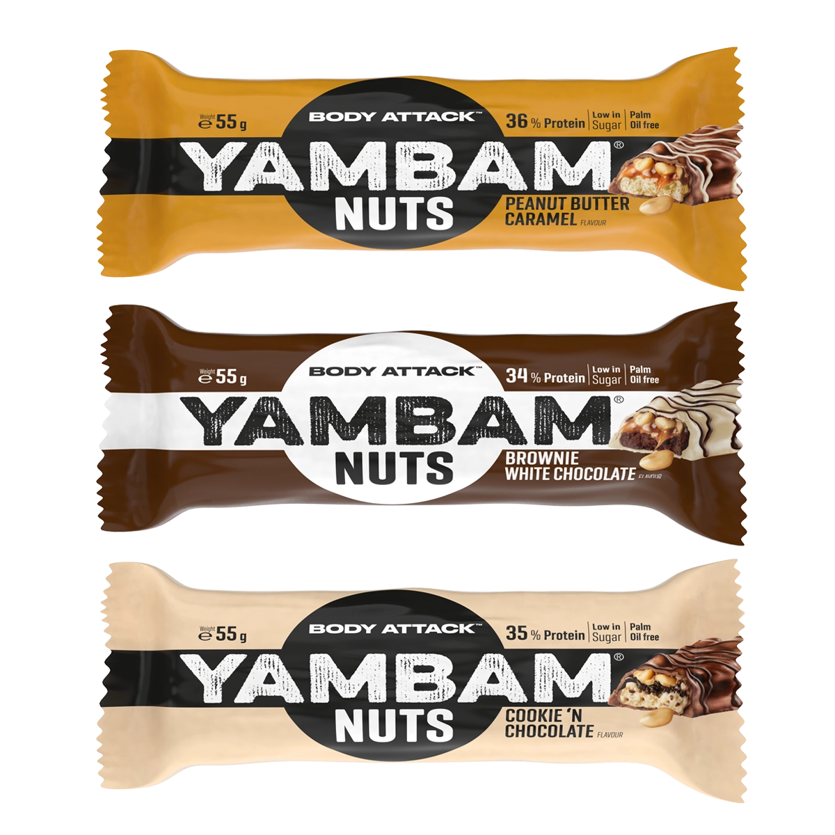 Du willst was auf die Nuss? Kannst du haben! Von ihm hier. Der hat’s richtig drauf. Gestatten: YAMBAM NUTS. Der unschlagbare Proteinriegel mit dem einzigartigen Geschmack. Kaum Zucker. Dafür mehr Protein. Mehr Power. Seinen einzigartigen Charakter verleihen ihm knackige Erdnüsse, softes Karamell und eine Schicht aus zartschmelzender Vollmilchschokolade. Dazu über 30% bestes Protein für deine Muskeln. Unseren gesunden Snack gibt es in drei leckeren Sorten. Suchtgefahr garantiert! Für wen ist der YAMBAM NUTS genau der richtige Riegel? Für Kraft- und Ausdauersportler Für Fitness-Fans und Figurbewusste Für alle Erdnuss-, Schokoladen- und Protein-Junkies. Für welche Ziele ist der YAMBAM NUTS die richtige Wahl? Diät- und Definitionsphasen Gesunde, proteinreiche Ernährung Für den kleinen oder großen Hunger zwischendurch Gesunder Snack – Der Riegel der Superlative Für alle, die Erdnüsse lieben. Und Schokolade. Unser YAMBAM NUTS Riegel vereint eine Extraportion knackige Erdnüsse im zartschmelzendem Schokoladenmantel mit bestem Protein. Kaum Zucker. Dafür 100% Geschmack. Diesen Proteinriegel muss man einfach lieben. Der süß-knusprige, gesunde Snack ist der perfekte Begleiter. Er stillt garantiert jeden kleinen und großen Schokoladenhunger und bringt Erdnuss-Junkies zum Träumen. Mit YAMBAM NUTS erlebst du satten Geschmack. Proteinreich. Gesund. Maximale Protein-Power für deine Muskeln Unser Energieriegel überzeugt mit über 30% Protein. Und die Proteinmischung hat es in sich. Hochwertiges Milcheiweiß, Molkenprotein-Konzentrat und Sojaprotein-Isolat stecken in unserem YAMBAM NUTS und versorgen dich mit maximaler Protein-Power. Proteine braucht dein Körper immer. Beim Sport. Im Büro. Unterwegs im Alltag. Proteine unterstützen dich beim Muskelaufbau und sorgen dafür, dass bestehende Muskulatur erhalten bleibt. Außerdem hält Eiweiß lange satt. Du isst automatisch weniger – perfekt als gesunder Snack in Diätphasen. Wie viel Zucker steckt in einem YAMBAM NUTS-Riegel? Unser YAMBAM NUTS Riegel enthält nur 4% Zucker. Das ist viel weniger, als herkömmliche Schokoriegel enthalten. Der Kohlenhydratanteil ist in unserem Proteinriegel deutlich reduziert. Komplett auf Kohlenhydrate verzichten wollen wir in unserem Super-Riegel aber nicht. Denn Kohlenhydrate versorgen dich mit Power, die du im Alltag und im Training unbedingt brauchst. Wieso kommt unser YAMBAM NUTS quasi ohne Zucker aus? In unserem YAMBAM NUTS haben ungesunde Zuckermassen nichts zu suchen. Wir setzen auf die natürliche Süße feinster Produkte wie Maltit. Das Süßungsmittel enthält kaum Kalorien, sorgt aber für die perfekte Süße. Wissen, was wirklich gut ist. Markenliebling. Was haben unsere Premium-Riegel YAMBAM NUTS, CARB CONTROL und POWER PROTEIN BAR gemeinsam? Richtig! Sie alle wurden in der Kategorie Energieriegel der Zeitschrift Freundin als Markenliebling ermittelt. Gemeinsam mit dem Statistikunternehmen Statista erforscht die Erfolgszeitschrift jedes Jahr, welche Marken weiterempfohlen werden. Das unsere Riegel dabei sind, macht uns natürlich mächtig stolz. Wir investieren viel Zeit und Energie in die Entwicklung bestmöglicher Produktformeln. Dabei forschen wir sowohl an Roh- und Inhaltsstoffen als auch an umweltfreundlichen Produktions- und Verpackungsverfahren. Denn Nachhaltigkeit, Umweltbewusstsein und ressourcenschonendes Handeln hat bei uns Priorität. Die YAMBAM NUTS Verpackung besteht daher überwiegend aus nachwachsenden Rohstoffen. Dies wird durch den Einsatz von Cellulose und modifizierter Stärke ermöglicht. Bist du bereit für den leckersten Crunch deines Lebens! Dann probiere auch unseren neuen YAMBAM CRUNCH. Hochwertiges Protein, knackige Schokolade und mächtig crunchige Crispies haben wir in diesem Riegel vereint. Mit über 30 % Protein und extra Ballaststoffen hält dich der YAMBAM CRUNCH nicht nur satt, er bekämpft auch jegliche Heißhungerattacken! Wie der YAMBAM NUTS ist auch dieser Riegel palmölfrei und hat nur wenig Zucker. Taste it!