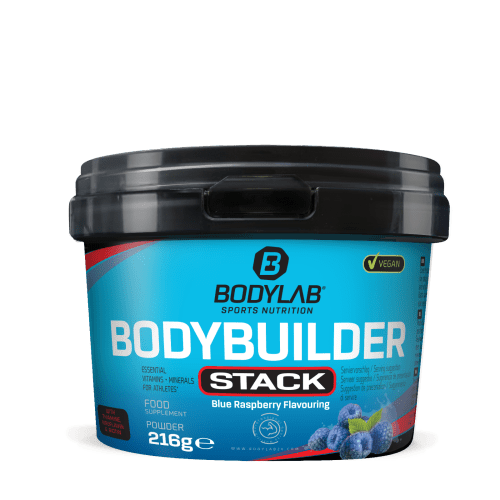 Bodybuilder Stack Powder Pulver von Bodylab24 mit Blaue Himbeere Geschmack in der 0.216KG Packung. Bodybuilder Stack Powder – die Mikronährstoffversorgung für aktive Menschen Sportlich aktiv? Du forderst deinen Körper täglich heraus? Dann solltest du deinen Nährstoffhaushalt immer im Blick behalten. Bodybuilder Stack Powder ist ein hochwertiges Vitamin- und Mineralstoffsupplement in Pulverform – speziell entwickelt, um einen erhöhten Bedarf an wichtigen Mikronährstoffen in intensiven Trainingsphasen oder in stressigen Alltagssituationen und einem aktiven Lebensstil zu unterstützen. Denn es braucht mehr als nur Energie aus Makronährstoffen für eine optimale Performance. In intensiven Trainingsphasen verbraucht der Körper neben den Makronährstoffen (Proteine, Fette und Kohlenhydrate) auch vermehrt ebenso wichtige Mikronährstoffe, die der Körper in der Regel ebenfalls über die Nahrung aufnimmt. Dieser Verlust sollte, um das allgemeine Wohlbefinden, die Regeneration und die allgemeine Leistungsfähigkeit optimal zu unterstützen, ausgeglichen werden, damit weiteren, intensiven Trainingseinheiten nichts im Wege steht. Enthalten sind zahlreiche Vitamine von A-K (inkl. zahlreicher B-Vitamine) und essenzielle Mineralstoffe und Spurenelemente von Chrom, Kalzium über Magnesium bis zu Zink. Das Bodybuilder Stack Powder liefert damit zahlreiche Mikronährstoffe, die dein aktiver Körper braucht – einfach, effektiv und in bester Qualität. Einige Wirkungsweisen der essenziellen Vitamine und Mineralstoffe auf einen Blick: Die enthaltenen B-Vitamine (B1, B2, B6, B12, Niacin, Biotin, Pantothensäure) tragen zu einem normalen Energiestoffwechsel und zur Verringerung von Müdigkeit und Ermüdung bei. Vitamin C trägt unter anderem zu einer normalen Funktion des Immunsystems bei. Magnesium trägt zur Verringerung von Müdigkeit und Ermüdung bei, ist am normalen Energiestoffwechsel und der normalen Muskelfunktion beteiligt. Calcium trägt zu einer normalen Muskelfunktion und zu einem normalen Energiestoffwechsel bei. Eisen trägt zu einem normalen Energiestoffwechsel, zu einer normalen Funktion des Immunsystems und zur Verringerung von Müdigkeit und Ermüdung bei und hat eine Funktion bei der Zellteilung. …um nur einige Vorteile und Wirkungsweisen der Inhaltsstoffe zu nennen. Einfach und problemlos in der Anwendung und trotzdem eine maximale Wirkung erzielen. Bodybuilder Stack Powder mit Wasser mischen und rund ums Training trinken – fertig. Bodybuilder Stack Powder – eine sorgfältig abgestimmte Formel aus B-Vitaminen, weiteren essenziellen Vitaminen, Mineralstoffen und Spurenelementen. Egal ob beim intensiven Cardio-, Krafttraining oder im Alltag – dein Körper gibt alles und nutzt dazu zahlreiche Nährstoffe. Gib ihm einfach und unkompliziert wichtige Mikronährstoffe zurück – mit einem erfrischenden Drink.