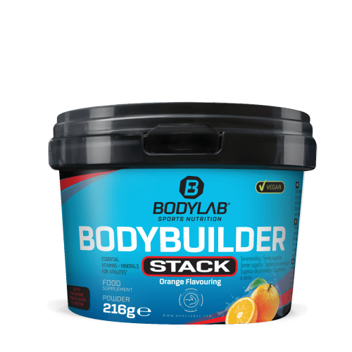 Bodybuilder Stack Powder Pulver von Bodylab24 mit Orange Geschmack in der 0.216KG Packung. Bodybuilder Stack Powder – die Mikronährstoffversorgung für aktive Menschen Sportlich aktiv? Du forderst deinen Körper täglich heraus? Dann solltest du deinen Nährstoffhaushalt immer im Blick behalten. Bodybuilder Stack Powder ist ein hochwertiges Vitamin- und Mineralstoffsupplement in Pulverform – speziell entwickelt, um einen erhöhten Bedarf an wichtigen Mikronährstoffen in intensiven Trainingsphasen oder in stressigen Alltagssituationen und einem aktiven Lebensstil zu unterstützen. Denn es braucht mehr als nur Energie aus Makronährstoffen für eine optimale Performance. In intensiven Trainingsphasen verbraucht der Körper neben den Makronährstoffen (Proteine, Fette und Kohlenhydrate) auch vermehrt ebenso wichtige Mikronährstoffe, die der Körper in der Regel ebenfalls über die Nahrung aufnimmt. Dieser Verlust sollte, um das allgemeine Wohlbefinden, die Regeneration und die allgemeine Leistungsfähigkeit optimal zu unterstützen, ausgeglichen werden, damit weiteren, intensiven Trainingseinheiten nichts im Wege steht. Enthalten sind zahlreiche Vitamine von A-K (inkl. zahlreicher B-Vitamine) und essenzielle Mineralstoffe und Spurenelemente von Chrom, Kalzium über Magnesium bis zu Zink. Das Bodybuilder Stack Powder liefert damit zahlreiche Mikronährstoffe, die dein aktiver Körper braucht – einfach, effektiv und in bester Qualität. Einige Wirkungsweisen der essenziellen Vitamine und Mineralstoffe auf einen Blick: Die enthaltenen B-Vitamine (B1, B2, B6, B12, Niacin, Biotin, Pantothensäure) tragen zu einem normalen Energiestoffwechsel und zur Verringerung von Müdigkeit und Ermüdung bei. Vitamin C trägt unter anderem zu einer normalen Funktion des Immunsystems bei. Magnesium trägt zur Verringerung von Müdigkeit und Ermüdung bei, ist am normalen Energiestoffwechsel und der normalen Muskelfunktion beteiligt. Calcium trägt zu einer normalen Muskelfunktion und zu einem normalen Energiestoffwechsel bei. Eisen trägt zu einem normalen Energiestoffwechsel, zu einer normalen Funktion des Immunsystems und zur Verringerung von Müdigkeit und Ermüdung bei und hat eine Funktion bei der Zellteilung. …um nur einige Vorteile und Wirkungsweisen der Inhaltsstoffe zu nennen. Einfach und problemlos in der Anwendung und trotzdem eine maximale Wirkung erzielen. Bodybuilder Stack Powder mit Wasser mischen und rund ums Training trinken – fertig. Bodybuilder Stack Powder – eine sorgfältig abgestimmte Formel aus B-Vitaminen, weiteren essenziellen Vitaminen, Mineralstoffen und Spurenelementen. Egal ob beim intensiven Cardio-, Krafttraining oder im Alltag – dein Körper gibt alles und nutzt dazu zahlreiche Nährstoffe. Gib ihm einfach und unkompliziert wichtige Mikronährstoffe zurück – mit einem erfrischenden Drink.