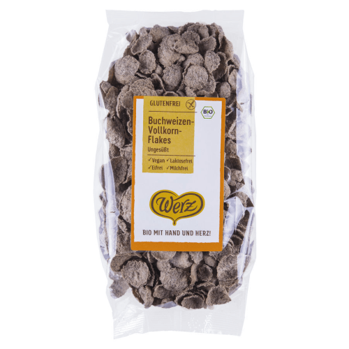 Buchweizen Flakes ungesüßt bio Werz. Was sind Buchweizen Flakes ungesüßt von Werz und wie wirken sie? Buchweizen Flakes ungesüßt von Werz werden auf biologische Weise aus dem Naturkorn Buchweizen gewonnen. Die schonende Herstellung sorgt dafür, dass die wesentlichen Bestandteile an Eiweiß, Kohlenhydraten und Fettsäuren erhalten bleiben. Das Produkt ist frei von Cholesterin, Ei, Gluten, Hefe, Milcheiweiß und somit auch für Vegetarier und Veganer geeignet. Nimm Buchweizen Flakes ungesüßt von Werz als Grundlage von leckeren Müslis. Du kannst sie auch zu Joghurt oder Quark hinzugeben oder zum Backen verwenden. Eco control number: DE-ÖKO-007 Knusprig und lecker!