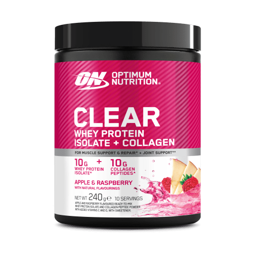 Clear Whey + Collagen Pulver von Optimum Nutrition mit Apple Raspberry Geschmack in der 0.24KG Packung. Wer eine vielseitige Proteinquelle mit angenehm leichter Konsistenz sucht, trifft mit Clear Whey + Collagen eine gute Wahl. Clear Whey + Collagen vereint hochwertiges Whey Protein Isolat und Kollagenpeptide in einem klaren, fruchtigen Getränk. Die besondere Kombination bietet eine leichte Alternative zu klassischen, cremigen Eiweißshakes. Jede Portion enthält 10g Whey Protein Isolat und 10g Kollagenpeptide, ergänzt durch Vitamin C. Das Produkt ist in zwei fruchtigen Geschmacksrichtungen erhältlich: Apple Raspberry und Summer Ice Tea. Clear Whey + Collagen eignet sich ideal für den Start in den Tag, als Begleiter vor dem Training oder als erfrischender Shake zwischendurch.