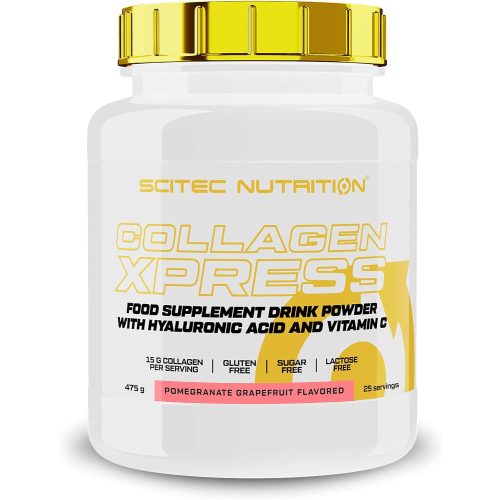 Collagen Xpress Pulver von Scitec Nutrition mit Granatapfel-Grapefruit Geschmack in der 0.475KG Packung. Collagen Xpress von Scitec Nutrition Collagen Xpress von Scitec Nutrition enthält pro Portion ganze 15 Gramm Kollagen. Außerdem enthält es auch noch Vitamin C und Hyaluronsäure. Worauf wartest du noch? Gönn dir eine extra Portion Kollagen! Das „Beauty-Protein“.